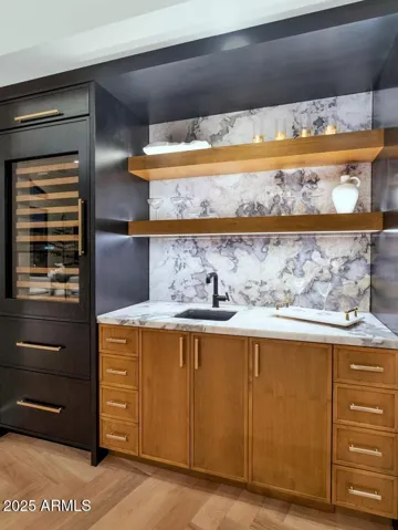 An adjacent wet bar with Subzero wine fridge, clad in matching oyster white marble and designer finishes, provides the perfect complement to the kitchenideal for hosting with ease and elegance.