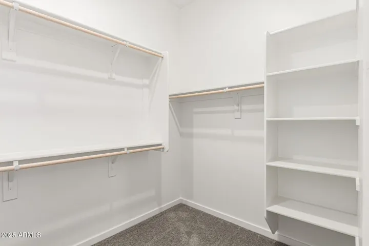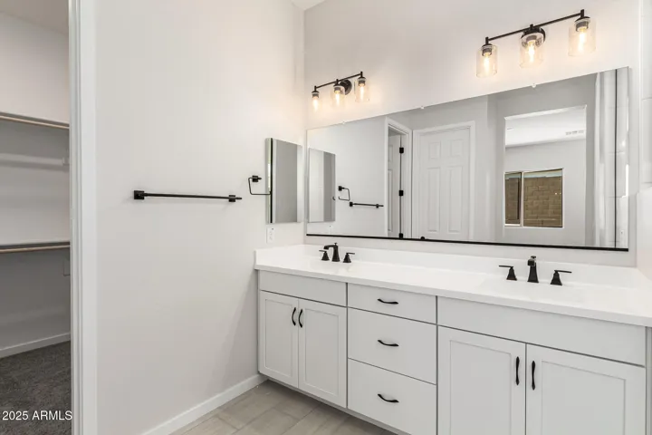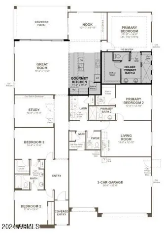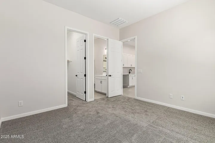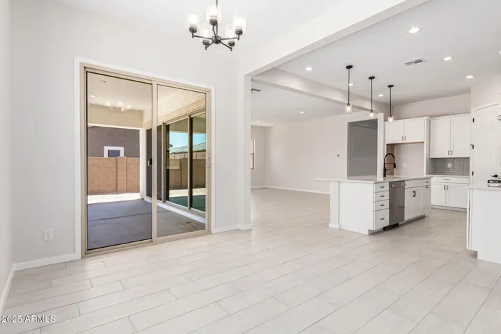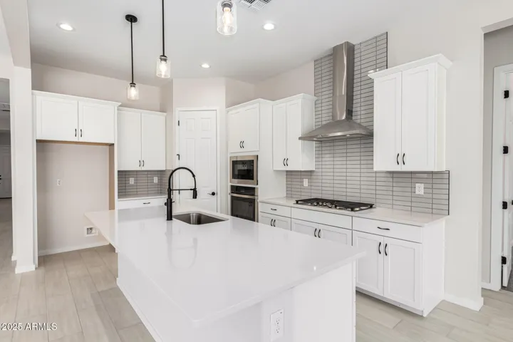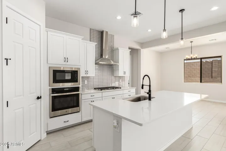 Part of the Modern Living collection, The Darius provides a sophisticated and accommodating ranch-style layout. In addition to a lavish primary suite with a roomy walk-in closet and attached double-sink bath with an upgraded deluxe tile shower-this home includes a second primary suite with an adjacent living room, perfect for multi-generational living. You’ll also enjoy a 3-car garage, a study, a great room with an adjacent covered patio-featuring multi-slider doors, two additional bedrooms that share a jack and jill bathroom, and an inviting gourmet kitchen with a generous island, built-in pantry, 42” white cabinets with matte black pulls, quartz countertops, tile backsplash, GE Plus stainless-steel appliances with chimney hood and 36” gas cooktop and an adjacent dining nook. This home has contemporary square casing throughout, 9 x 35 tile flooring with carpet only in the bedrooms, matte black hardware. lighting and faucet packages throughout, pendant lighting at the kitchen island, and a full wet bar with upper and base cabinets in the guest living room. In addition, 10 ft ceilings, two-tone paint, ceiling fan prewires in the bedrooms, great room, study and covered patio, soft water loop in the garage, laundry sink pre-plumb, garage service door, paver driveway and walkway, front yard landscaping and exterior coach lights are also included. This home is situated on an 8760 square foot lot with a double side gate.
