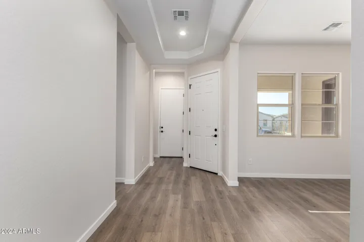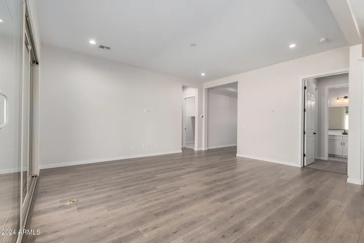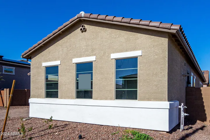 This home features a lovely Guest Suite as well as dramatic 10′ ceilings throughout and a tray ceiling at entry; a gourmet kitchen with quartz countertops, 42” cabinets, a spacious open great room with a multi-slide door; a beautiful primary suite with a generous walk-in closet. The walk-in shower features a rain shower head. This home offers stylish pavers at driveway/walkway.