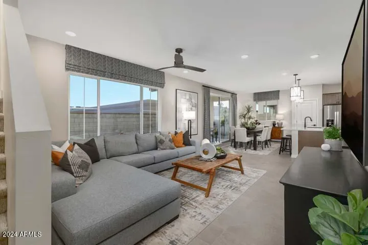 FORMER MODEL HOME! Ready for Quick Move-In. 3 BR + study / 2.5 BA. Kitchen with island and ”Landen Maple” Burlap cabinetry, white quartz countertops & white-grey herringbone kitchen backsplash with under cabinet lighting. Upgraded tile flooring in all living areas with upgraded carpet in bedrooms, hallways & closets! Dual vanity sinks in both full bathrooms. LED lighting and upgraded light fixtures throughout, smart switches, two-tone paint. This home also features a landscaped backyard with paver patio & washer, dryer, fridge & window treatments included!