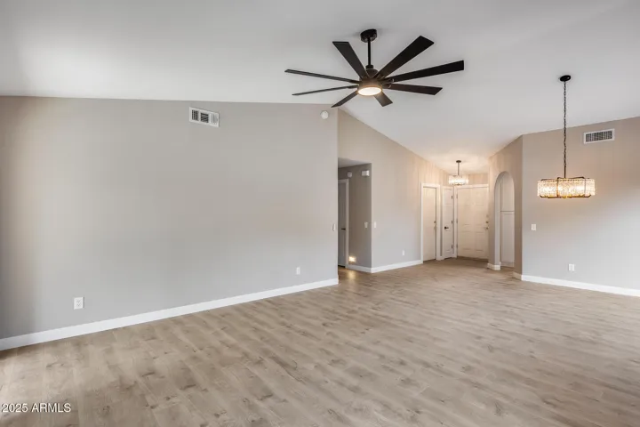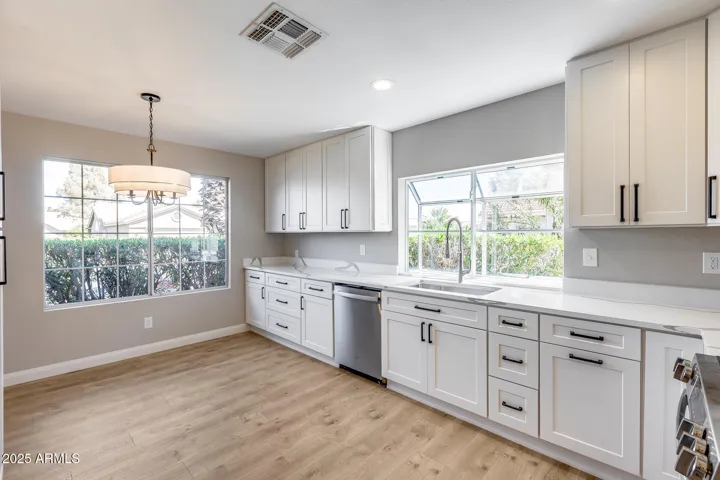 This beautifully remodeled 2-bedroom, 2-bathroom home is nestled in a vibrant gated adult community, offering 1,583 sq. ft. of inviting living space. Tall vaulted ceilings, sunscreened windows, and a spacious family room enhance the inviting atmosphere, complemented by Luxury Vinyl Plank flooring throughout. The updated kitchen showcases white cabinets, stylish hardware and white quartz countertops, while the remodeled bathrooms feature matching white cabinets and quartz countertops, tile flooring and tasteful finishes. The covered patio overlooks a large lot, with easy-care desert landscaping in both the front and back yards. Take advantage of the fantastic community amenities, including a clubhouse, heated pool and spa, golf course, lake subdivision, workout facility, and more! This beautifully remodeled 2-bedroom, 2-bathroom home is nestled in a vibrant gated adult community, offering 1,583 sq. ft. of inviting living space. Tall vaulted ceilings, sunscreened windows, and a spacious family room enhance the inviting atmosphere, complemented by Luxury Vinyl Plank flooring throughout. The updated kitchen showcases white cabinets, stylish hardware and white quartz countertops, while the remodeled bathrooms feature matching white cabinets and quartz countertops, tile flooring and tasteful finishes. The covered patio overlooks a large lot, with easy-care desert landscaping in both the front and back yards. Take advantage of the fantastic community amenities, including a clubhouse, heated pool and spa, golf course, lake subdivision, workout facility, and more!