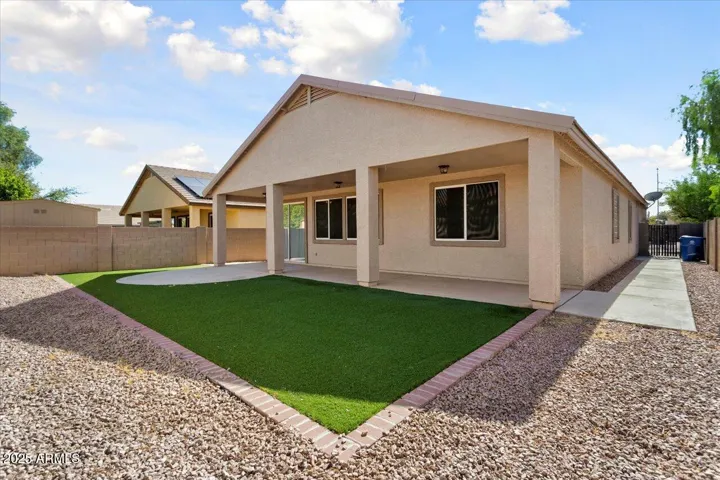 Ready for your personal touches! This 3-bed, 2-bath home with potential for 5 bedrooms, just add closets to the den and flex room. Great curb appeal with synthetic grass and mature landscaping leads to an entry with custom medallion tile. A spacious great room with stone fireplace and built-ins flows into the kitchen with cathedral cabinets, large island, breakfast bar, and dining area. High ceilings and big windows fill the home with light. Sliding doors open to a private yard with extended covered patio, stone accents, and synthetic grass. Split floor plan offers privacy, with a primary suite featuring a walk-in closet, soaking tub, shower, and dual sinks. Tile in main areas, carpet in bedrooms, wood blinds, and paneled doors throughout. Recent repairs completed for a smooth closing! Privacy is wonderful, with no 2 stories looking in your back yard.