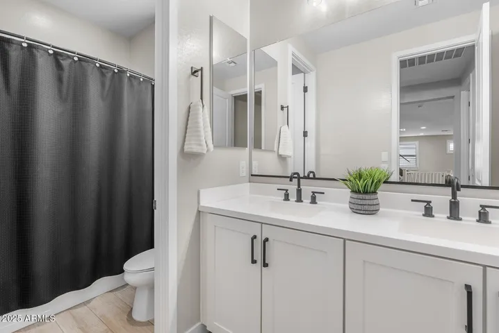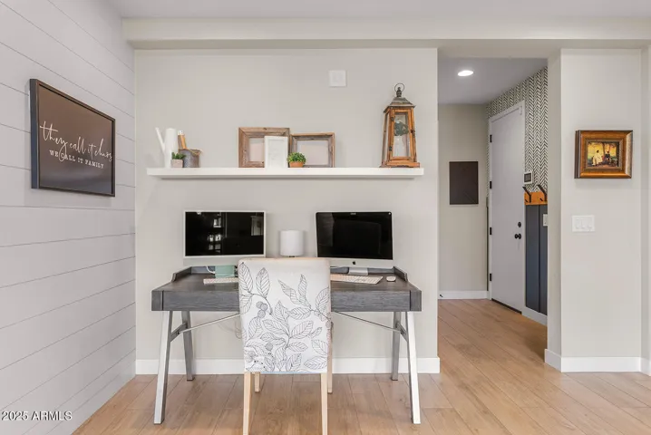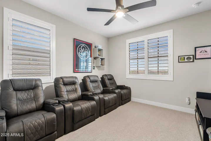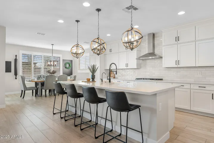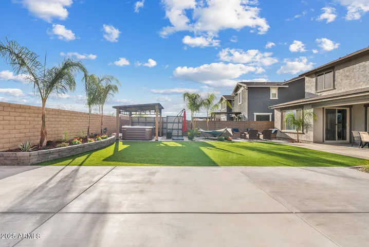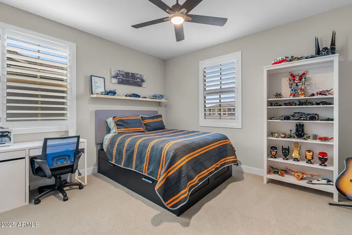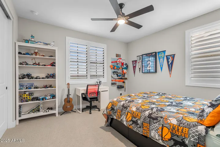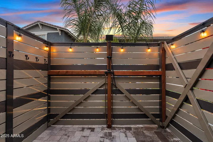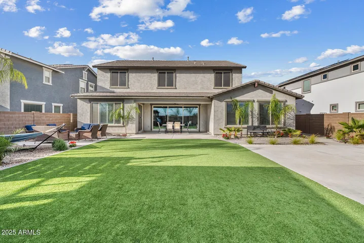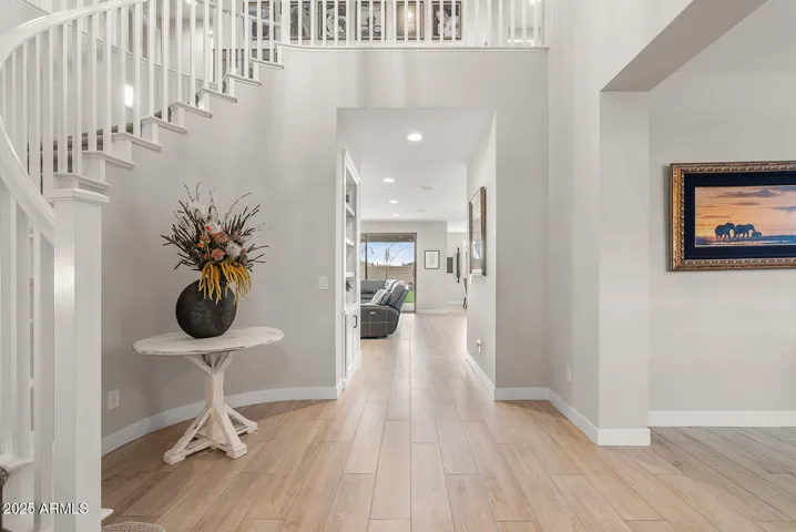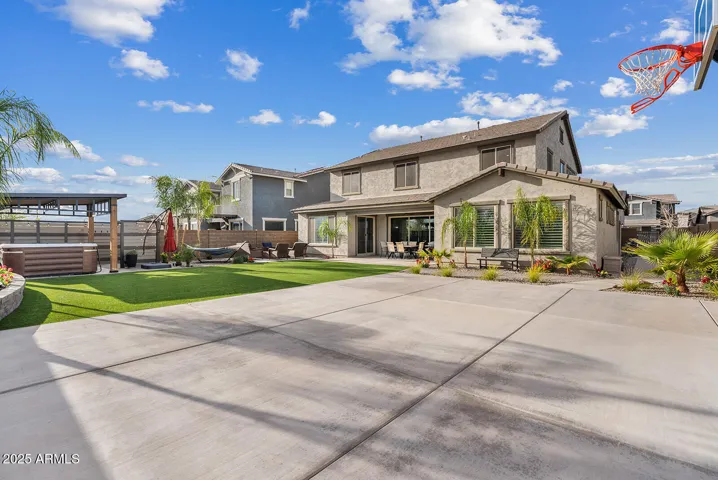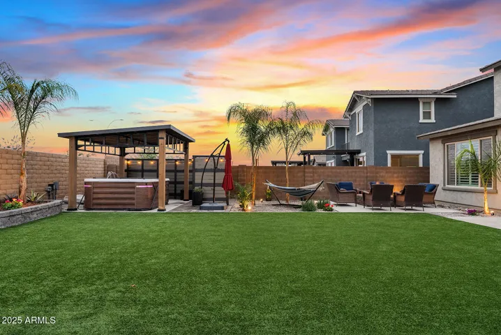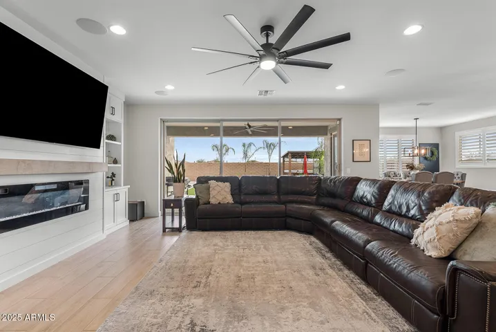 This stunning home offers undeniable charm, starting with its inviting curb appeal. Stone accents, artificial turf, landscape lighting, and a spacious front porch complete with a charming swing create a warm welcome. Step inside to a grand entrance where a striking spiral white staircase takes center stage, complemented by fresh neutral paint, wood shutters, and upgraded modern baseboards. Just off the entryway, you’ll find a designated office space that combines style and function with a bold black built-in bookshelf, natural wood countertops, brick accents, and even a beverage fridge. The heart of the home is the chef’s kitchen, designed to impress. A massive island offers ample seating and prep space, while modern pendant lights add a touch of elegance. The kitchen features white shaker cabinets that extend to the ceiling for added storage, sleek black hardware, a single apron sink, and a spacious walk-in pantry. Reverse osmosis ensures fresh, clean drinking water. This stunning kitchen seamlessly flows into the main living room, which is bathed in natural light and features a built-in electric fireplace framed by shiplap, built-in cabinets, and shelving. Surround sound completes this inviting space, perfect for relaxing or entertaining. A thoughtfully designed powder bathroom nearby boasts an upgraded wood panel feature wall along with modern fixtures and a stylish mirror. The primary suite is a true retreat, complete with its own enclosed electric fireplace surrounded by shiplap, built-in drawers, a natural wood mantel, and floating shelves. The ensuite bathroom feels like a spa getaway, offering dual sinks, artistic tile flooring, a separate vanity space, and a stunning super shower tiled to the ceiling with a rainfall shower head and built-in bench. The laundry room continues the home’s elevated design with built-in cabinets that extend to the ceiling, a shiplap accent wall, and a beautifully tiled backsplash behind the washer and dryer. Upstairs, a spacious loft provides the perfect bonus space for a play area, media room, or additional lounge space. Step outside to a backyard designed for both relaxation and entertainment. Landscape lighting sets the mood, while artificial turf with sprinklers ensures easy maintenance. Enjoy a soak in the spa, shoot some hoops on the basketball court, or unwind by the built-in fire pit. There’s even an outdoor charger for added convenience. The garage is equally impressive, featuring a service door, an electric vehicle charger, and a separate third-car garage for added flexibility.Nestled in a community that offers resort-style amenities such as a saltwater pool, fitness facility, parks, and a variety of organized clubs, this home blends luxurious upgrades with thoughtful design. Don’t miss your chance to make this exceptional home your own!