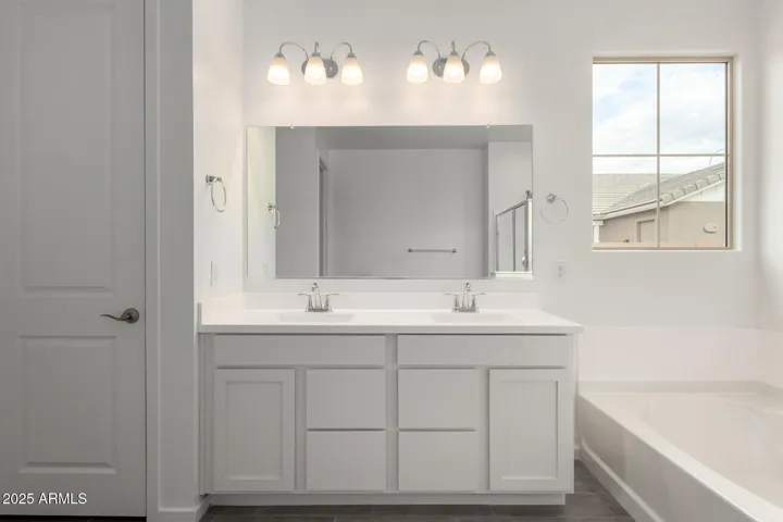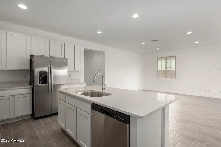 Ready for quick move-in on a homesite boasting driveway, walkway and entryway pavers and front yard landscaping. This home is 4 bedrooms, 3 bathrooms, 3-car garage approx. 2,070sf with a lot size of 7,983sf. Included features: an inviting covered entry; 9′ ceilings; a generous great room; an open dining area; kitchen offering 42” upper cabinets, GE stainless-steel appliances including gas range, kitchen side by side fridge, quartz countertops in the kitchen, a roomy pantry and a center island; center-meet sliding doors at the dining room leading to covered patio, a convenient laundry; an impressive primary suite showcasing a large walk-in closet and a separate shower and bathtub, private toilet room, cultured marble countertops; gas stub at back patio, tankless water heater, service door in the garage, loop for water softener, 8′ garage door and 3-car garage. This home also offers ceiling fan prewiring in bedrooms, great room and at covered patio and 7″x22″ tile flooring throughout the home with carpet in the bedrooms