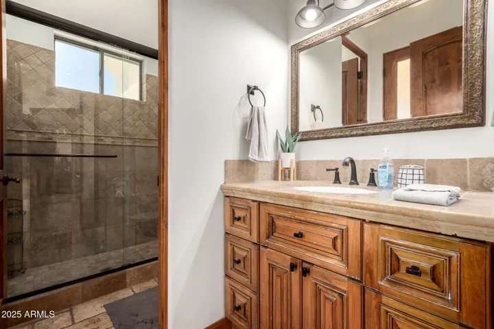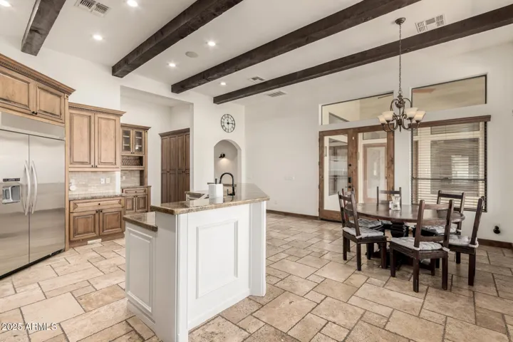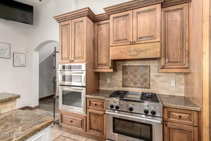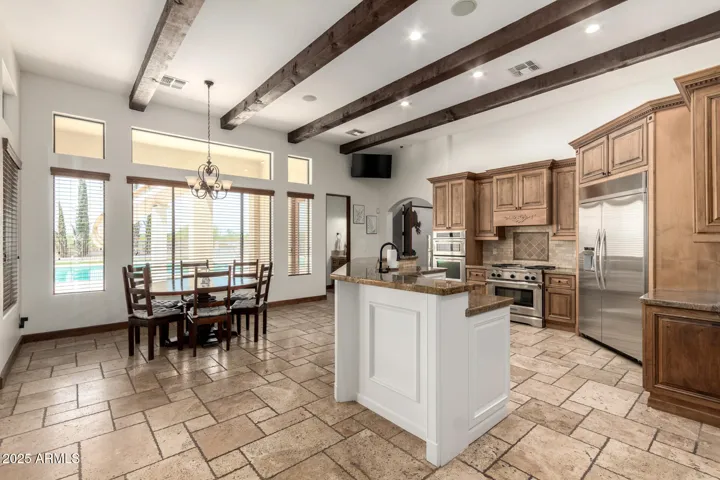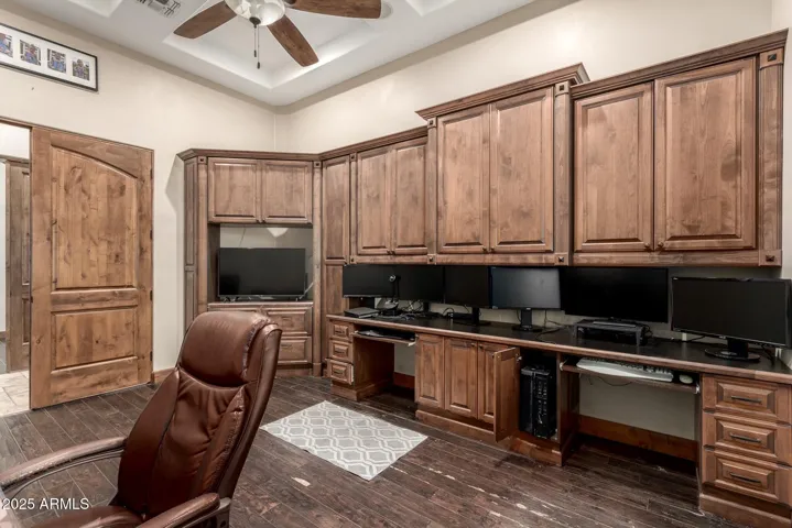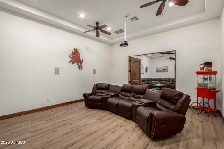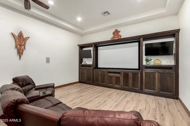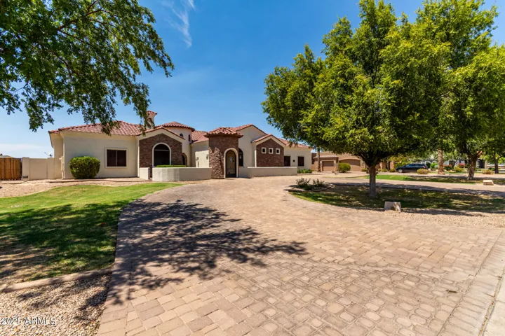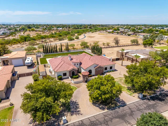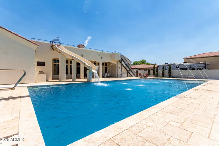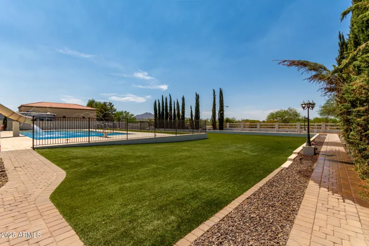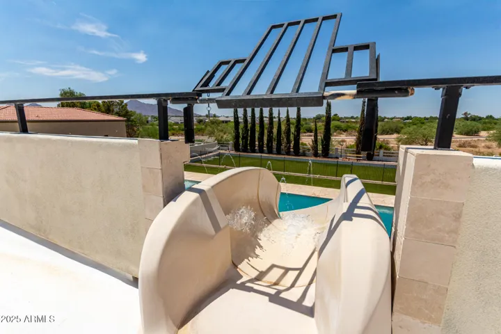 Indulge in luxury living with this exquisite 4-bedroom, 3-bath home nestled in a prestigious custom neighborhood. Soaring 10, 12, and 16-foot ceilings accentuate the elegance of travertine, carpet, and wood flooring throughout. Entertain in the expansive den or retreat to your private, spacious theater room with knotty alder doors. A charming library/sitting room offers a quiet escape, while each bedroom boasts custom closets. The oversized executive office features built-in cabinets and entertainment centers. The gourmet kitchen dazzles with granite countertops and custom cabinetry. Step outside to a rooftop stairway, commercial-size wet slide, and vast pool. Get lost in your oversized yard for all activities with breathtaking views. Enjoy 4-car garage for your toys.