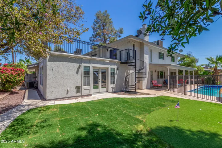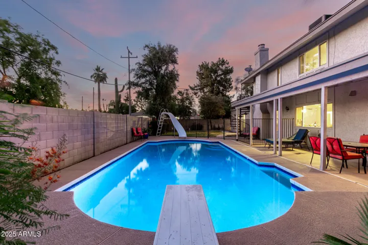 The backyard is ideal for relaxation and play, with a diving pool featuring a new pebble sheen surface, diving board, slide, and multi-colored LED lighting. A large natural grass area and putting green add space for recreation.