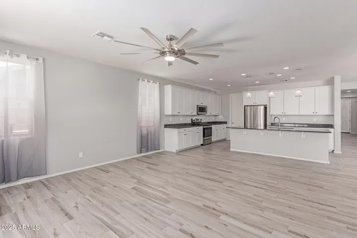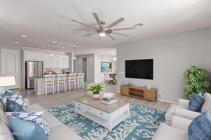 RV garage & a pool! This highly upgraded home features 3 bedrooms, Den & 2.5 bathrooms. Throughout you will notice the 8′ doors, abundance of recessed lighting & plank tile floors (everywhere except the bedrooms/den). The kitchen offers white cabinets with black handles (dovetail/ soft close drawers), Granite countertop, Stainless steel appliances (fridge included), Walk in pantry, Island with seating & upper/lower cabinet lighting. The primary suite overlooks the backyard with private exit to the back patio, Double sinks with granite top, huge soaking tub & custom tiled shower with frameless glass. Large walk-in closet that has a passthrough to the laundry room! Out back there is covered patio, lots of travertine pavers, putting green and accent lighting. Pebbletec pool with baja step & water feature is ready for your enjoyment! The RV garage features professionally epoxied floor, climate controlled with a mini split a/c, utility sink, lots of outlets including 220 for your electric car, RV or welder. 15′ ceilings give plenty of room for a car lift & a 14′ tall door to fit a class A RV! Walking distance to schools, 1 mile to shopping/ restaurants & close to the 202/ I10 freeways!