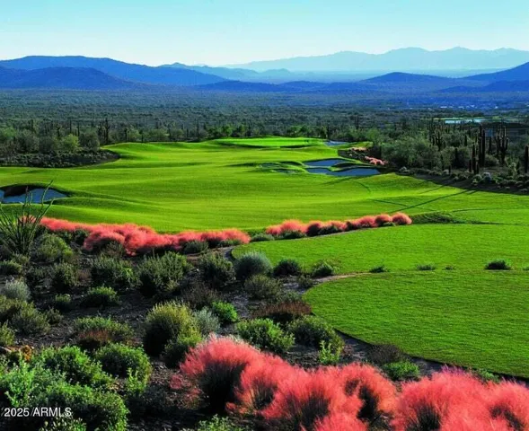 Your north-facing backyard is a low-maintenance desert oasis featuring lush turf, a putting green, mature shade trees, and a cozy fire table. ideal for both relaxing and entertaining.