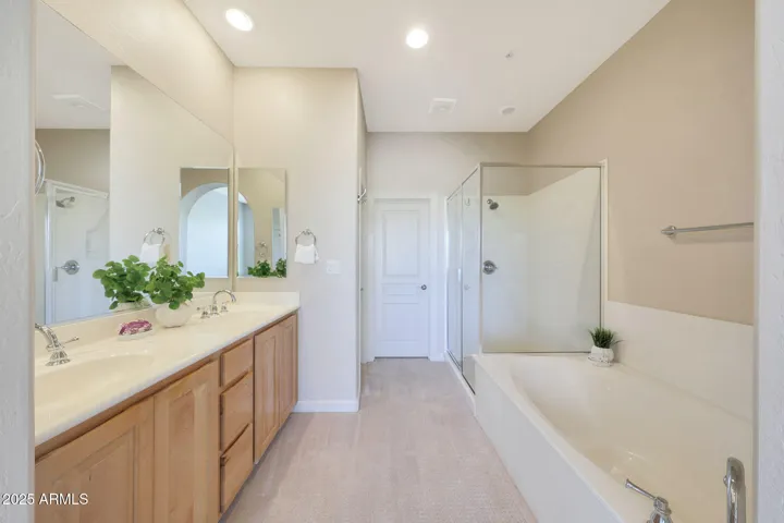 The spacious primary suite boasts a luxurious bath with dual vanities, a soaking tub, a walk-in shower, and a large walk-in closet.