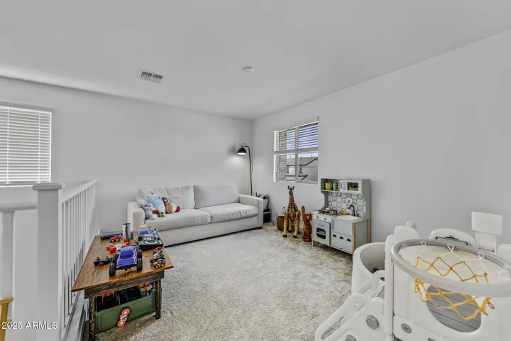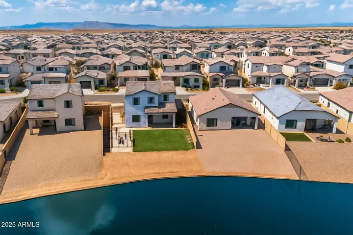 Downstairs you’ll find a versatile den and a spacious great room overlooking the water. Head upstairs to a generous loft, laundry room, and four bedrooms—all with walk-in closets. The primary suite includes a dual vanity bath and serene lake views. Enjoy Arizona evenings on your covered patio or unwind under the pergola in the grass backyard. Bring your paddleboat to launch from your own yard and float on the lake to experience the beautiful desert sunsets. The Lakes community features numerous playgrounds, walking paths, baseball fields and easy access in & out of Maricopa.