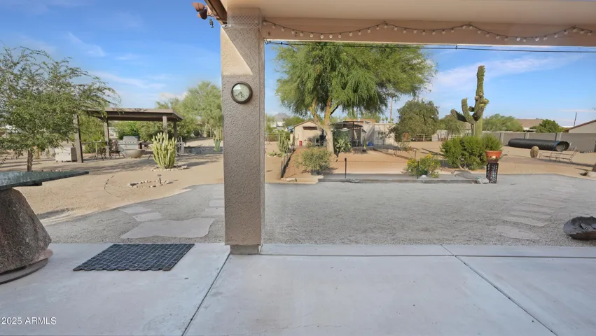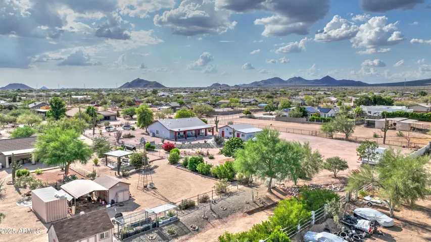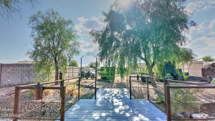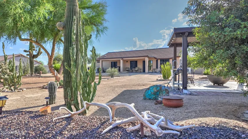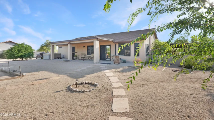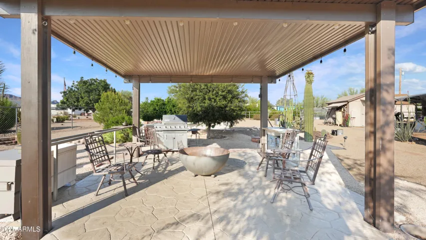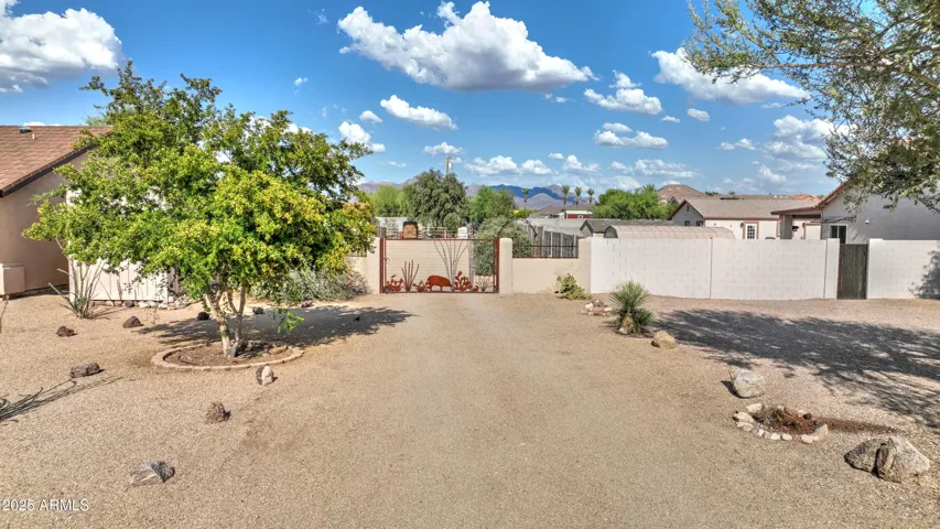 NEW PRICE ALERT!! Welcome to your private desert oasis, nestled on a spacious horse friendly 1.2-acre lot with breathtaking views of the Superstition Mountains. This well-maintained home welcomes horses (existing 14’x19′ metal carport great start for shaded stalls) and offers true Arizona living with natural desert landscaping, fruit trees, and room for all your toys –all with no HOA restrictions for RVs, Boats, and Trailers. Step inside to find tile flooring throughout, a remodeled spacious kitchen featuring an open layout, Thomasville cherry cabinets , breakfast bar, and a cozy bay-window eat-in area. The open great room provides a welcoming space for gatherings, while the primary suite includes patio access and a beautifully updated ensuite bathroom. Storage is never an issue, thanks to two Conex containers and an attached side-entry garage equipped with built-in shelving and its own mini-split system for climate control. Additional upgrades include a metal roof with a transferable lifetime warranty, metal facia, a water softener and reverse osmosis system, copper kitchen sink, security screens, wood burning firepit, insulated garage, and remodeled bathrooms that add modern comfort and style. Relax in your spa as you star gaze. This acre has room in the East back (dry wash) for all your entertaining needs – horseshoes, corn hole, even room for volleyball. Make sure to stroll through the gate, over the bridge to this area. Bridge is an ideal spot to watch the sun rise and enjoy coffee! This property offers the perfect blend of privacy, functionality, and natural beauty. Come experience the peaceful charm of desert living with thoughtful upgrades throughout.