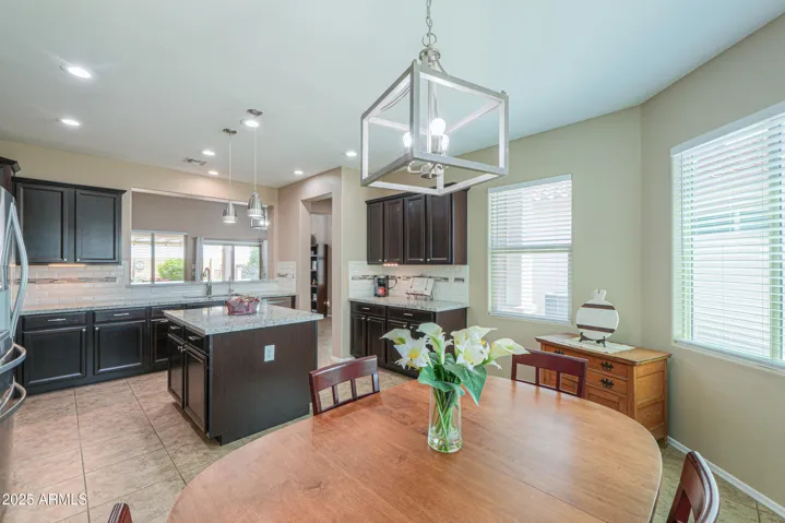 The primary suite includes a custom barn door leading to a beautifully appointed en-suite with dual sinks and a large walk-in shower. Enjoy Arizona living in your private backyard with covered patio, pergola extension, retractable sunshade, and low-maintenance turf. Additional highlights include fresh exterior paint, epoxy-coated garage floor, custom built-in garage cabinets. Energy-saving sunscreens and a secure screened front door provide comfort and peace of mind.