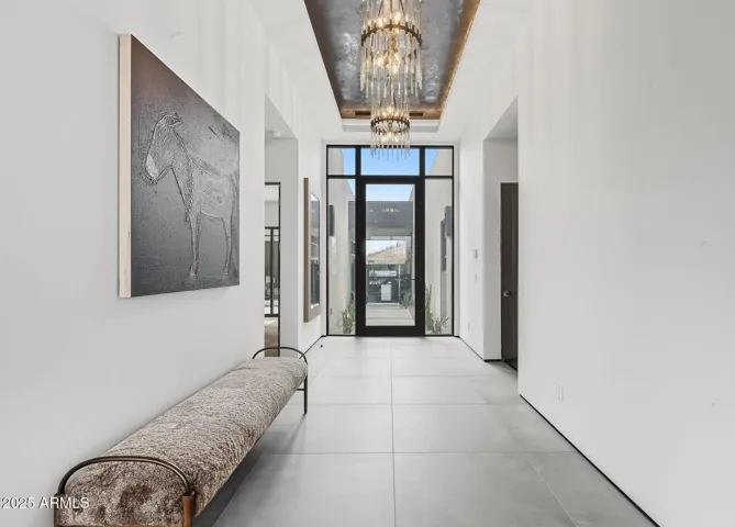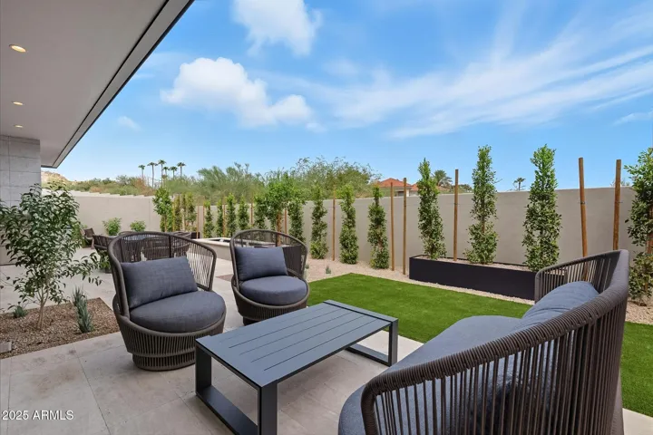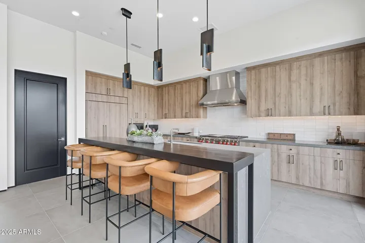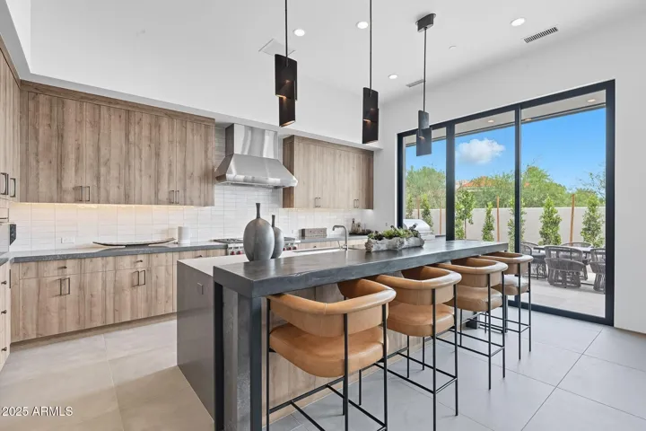Step through the private landscaped courtyard and enter either the beautifully appointed guest casita or the main residence through a dramatic glass entryway. The guest casita features an en-suite bath, kitchenette with sink, refrigerator, and two large built-in armoires; perfect for accommodating guests. As you walk into the main part of the home, a stunning sightline draws your eye through the open concept living area to the serene backyard, creating a welcoming experience. The chef’s kitchen is a statement in modern design, with custom cabinetry, a waterfall-edge quartz island, Sub-Zero, Wolf, and Cove appliances, and a removable live-edge wood bar with seating. A spacious walk-in pantry and wood-paneled appliances further enhance the contemporary aesthetic. The Great Room and Dining Areas are designed for both comfort and entertaining, featuring soaring 13-ft ceilings, a limestone-clad fireplace wall with an oversized hearth, and a full wall of glass that opens to the beautifully landscaped backyard. The private outdoor living space includes multiple lounge areas, a built-in BBQ, and sweeping mountain views, all surrounded by low-maintenance, desert-inspired landscaping. This North/South facing home is perfectly positioned to capture natural light while offering shade and comfort year-round.