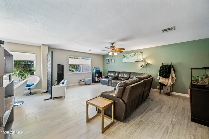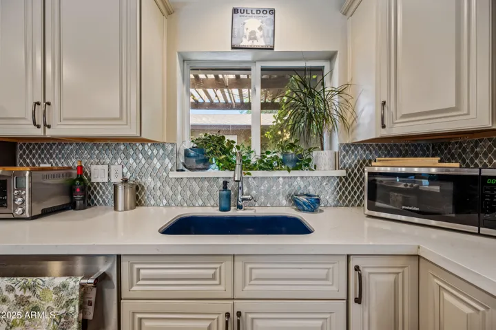 renovated in 2019, boasts custom cabinetry, a spacious new island, quartz countertops, and a designer tile backsplash. The dining Room/living room showcases a decorative fireplace with elegant Italian 3D tile and a stone hearth. A picture window to bring the outside in and enjoy a cool morning cupacoffee. A second bedroom is the perfect for a second primary suite with Carrara marble ensuite, sliding doors to enjoy the comfort of a covered patio and direct access to the fenced Pool. A third bedroom for office, guest or family. Bathrooms have been upgraded with modern cabinets, fixtures, and striking 3D Carrara tile work. The spacious primary suite includes a gorgeous dressing Room/Walk-in closet and a beautifully renovated bathroom with double sinks and inviting a walk-in-shower. New tile flooring runs throughout the home, with wood laminate in the bedrooms for added warmth. Additional highlights include a two-car garage currently used as a flexible living space, yoga room. 2 AC units on top of main house and a Newer 2023 mini split in second primary suit, also blown-in insulation, a new pool pump and filter, and a roof installed in 2008 with a 20-year warranty. Gutters with leaf filters help direct water efficiently from patios and garden areas. Enjoy a no-HOA neighborhood just minutes from downtown Scottsdale’s top dining, shopping, and entertainment. This renovated home is a true retreat and opportunity waiting for you. Honey Stop the CAR!