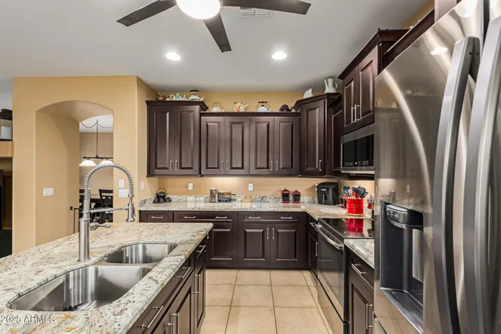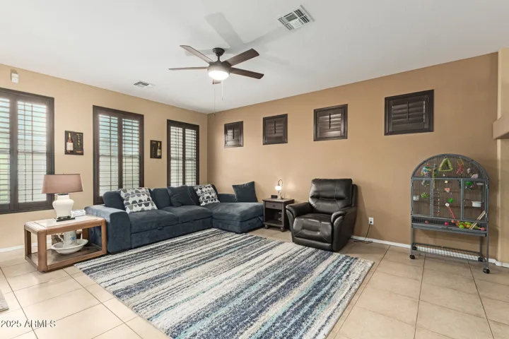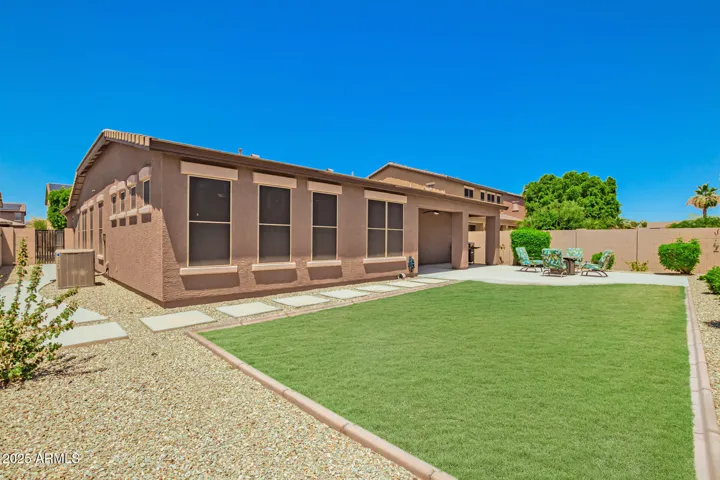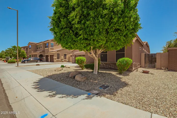 Remodeled & move-in ready! This single level home offers 3 bedrooms, a den, 2.5 bathrooms & more than 2,000 livable sq ft! Throughout you will notice the plantation shutters (on every window), 9′ ceilings, neutral paint, ceiling fans with remote & tile throughout (except 2 bedrooms which have new carpet with plush pad). Kitchen completely replaced less than a year ago! New solid wood cabinets (42” uppers, dove tail drawers, soft close doors, pull out shelves & nickel pull handles). Granite countertops, stainless steel appliances (stove is plumbed for gas), Under cabinet lighting, pantry & island with bar top seating. A/C replaced just 4 years ago, Water heater replaced this year & exterior also painted this year! Primary suite is large & offers new double vanity, framed mirror, new light fixtures, separate shower/ soaking tub, water closet & a walk in closet! This home has several energy efficient features including radiant barrier sheathing, sunscreens & energy efficient A/C with 3 zones. Extended garage that can fit 2 full size vehicles easily (nearly 580 sq ft) & has nice built-in cabinets, workbench, fans & a service door. Outside you will notice the long driveway that can fit 4 vehicles, corner lot gives some extra privacy, professionally landscaped front/backyard, covered patio with extended concrete pad & metal security doors front & back. This is not a flip, the seller spent some serious money making sure no corners were cut on the remodel! Great location with million-dollar homes just 300′ away. Schools, shopping, restaurants & gym all within walking distance! Just 2 miles away is the I10 & 303 freeways which can quickly get you across town. Don’t miss out on this great home in a fast growing part of Goodyear!