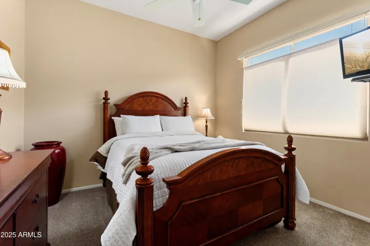 GREAT OPPORTUNITY in Trilogy at Vistancia! Currently the ONLY home over 2,000 SF listed under $550,000. This ‘Serenitas’ offers exceptional value at $253/sf, well below Trilogy $/SF comps. Featuring 2BR+Den, this home includes TWO NEW HVAC (a/c & heating) SYSTEMS-2023 and NEW EXTERIOR PAINT-2025. Popular SOUTH-FACING backyard is spacious & PRIVATE, surrounded by mature landscaping. Striking entry & rotunda both with distinctive updated light fixtures-2025-provide an impressive view of multiple rooms and backyard. The eat-in kitchen has abundant cabinets w/rollouts, granite on countertops & island, Samsung refrigerator, Bosch dishwasher, & large walk-in pantry nearby. The comfortable great room & dining/game room are ideal for entertaining. The primary suite has large bedroom, two closets one of which is a walk-in closet & a bath featuring dual sinks with cabinets, large shower & elevated toilet. The guest bedroom and bath are split from the primary suite. The two-car garage is loaded with storage cabinets + extra area for golf cart & more storage. Additional features include 10-ft ceilings, large floor tile in much of the home, Bali top-down/bottom-up window shades, new window treatments-2025- throughout, plantation shutters in the den/office with built-in desk, large covered patio with kool decking, built-in BBQ and two NEW ceiling fans-2025. ALL FURNITURE and most artwork & accessories are available BY SEPARATE BILL OF SALE FOR $1.00 with home purchase. CLOSE TO THE KIVA CLUB.