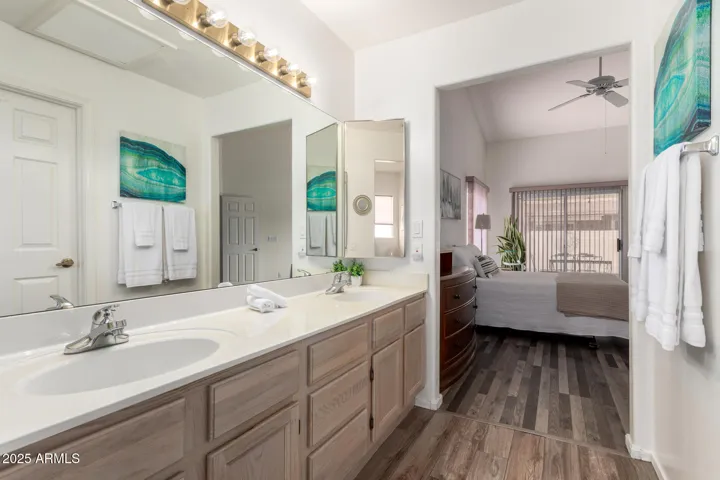Take a 2nd look, updated paint in some areas to make the home more desirable to your taste. Resort style living with 24 hour guard gated 55+ quiet community. Sun Village has it all! A brand new AC unit installed on July 02, 2025. Manicured landscape, a 2-car garage with epoxy flooring and attached garage cabinets. Inside, you’ll find tile flooring, soaring vaulted ceilings, carpet in all the right places, and neutral paint throughout. The well-appointed updated kitchen is complete with beautiful wood cabinets, pull out drawers, granite counters, pantry, and stainless steel appliances. Just off the kitchen is the perfect space for an office or crafting. There’s also a 1/2 bath for guest. Down the hall are 2 spacious primary bedrooms, each with a walk-in closet and its own bathroom The backyard boasts a cozy covered patio that’s ideal for morning coffee. Discover everything this adult community offers, such as the heated pool, spa, cabanas, workout facility, salon, library, golf shop, restaurant, monthly farmers market, walking path, shows, entertainment and more! Truly a must-see!