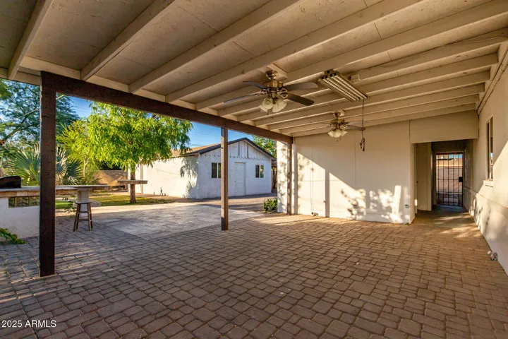 This home features an open layout with neutral finishes, wood-look tile floors, and ceiling fans throughout. The kitchen includes white cabinetry, tile counters, and a decorative backsplash. Outdoors, enjoy a covered patio, built-in BBQ area, and low-maintenance yard with pavers and artificial turf. A detached structure adds flexibility for a workshop, studio, or conversion potential.