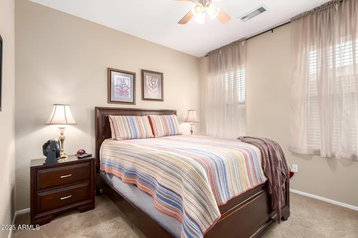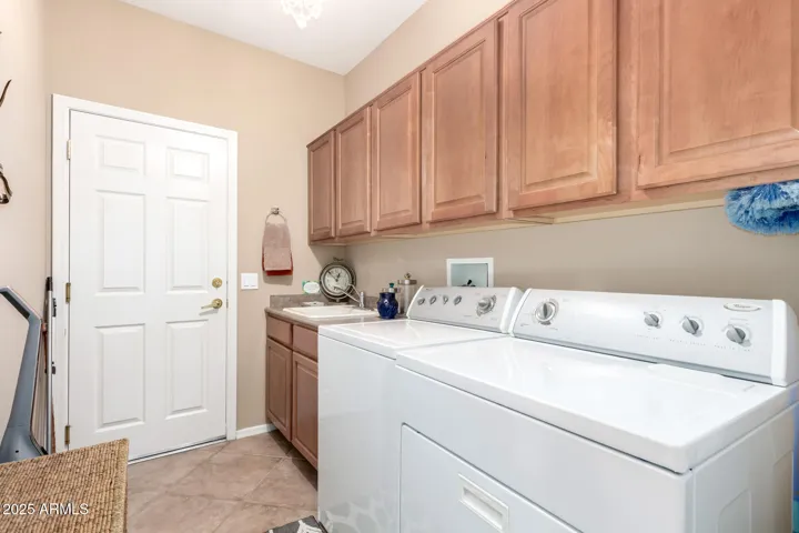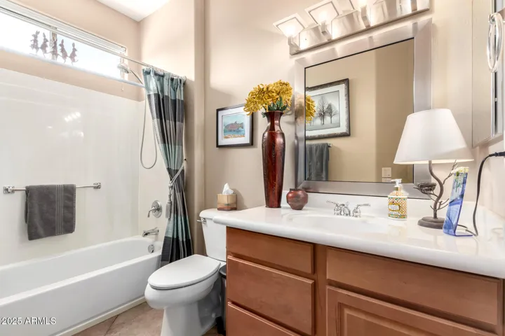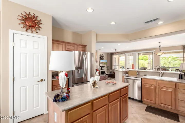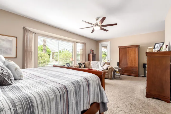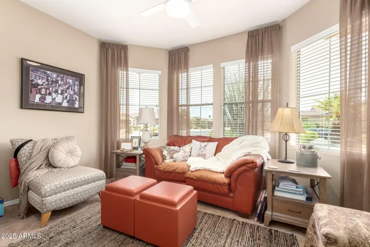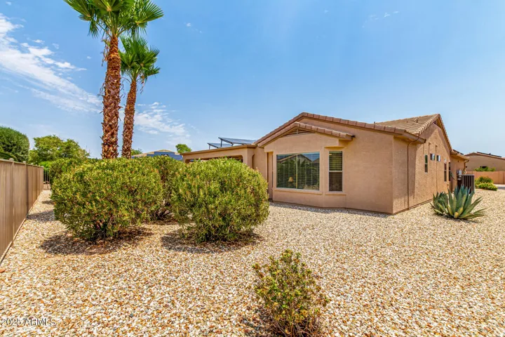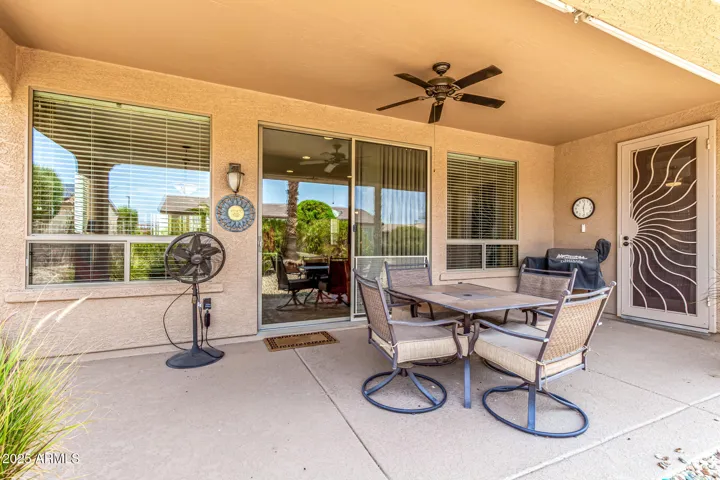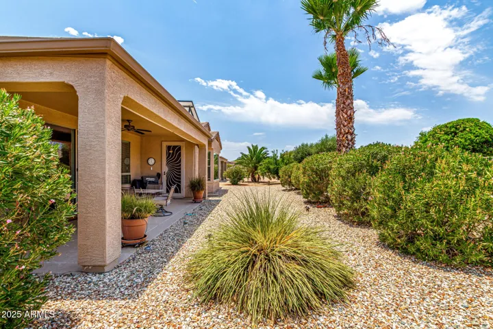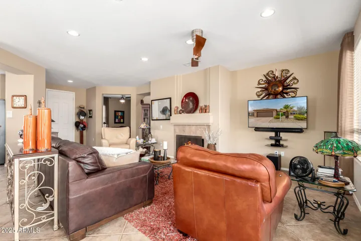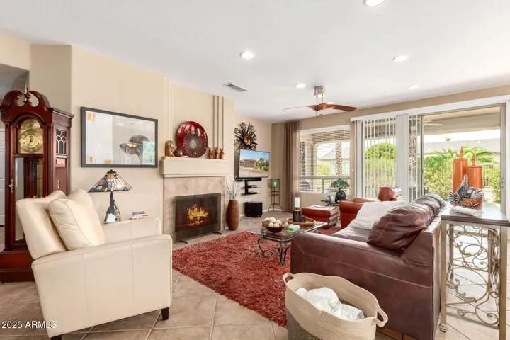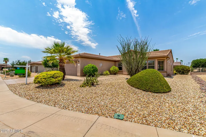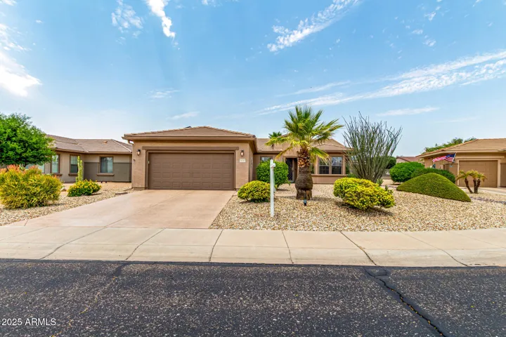SOLAR POWERED POPULAR SIERRA FLOORPLAN. Step into timeless comfort & style in this Sierra model, where thoughtful updates & pride of ownership shine throughout. From the moment you arrive, you’ll appreciate the extended garage with built-in storage cabinets, ideal for hobbies, tools, or extra space. Inside, premium 18” tile flooring spans the main living areas, while plush carpeting adds warmth to the den and bedrooms. The heart of the home is a spacious great room with a cozy gas fireplace, seamlessly connected to an extended covered patio, perfect for entertaining or simply enjoying a quiet Arizona evening. The expansive primary suite is a true retreat, featuring a bay window, a relaxing sitting area and direct patio access. The remodeled en-suite bath (2024) boasts dual sinks, elegant finishes, and a generous walk-in closet. Enjoy a sun-filled breakfast nook with its own bay window, a well-equipped laundry room with cabinets and a sink, and energy-efficient upgrades including a hot water recirculating system, whole-home water filtration, new A/C (2022) with UV air cleaner and surge protection for year-round comfort. Fresh exterior paint, a new garage door, and an updated irrigation system (2014) round out the upgrades. Bright, inviting, and incredibly livable. This home is ready for you to move right in and enjoy those low electric bills (see documents tab).
