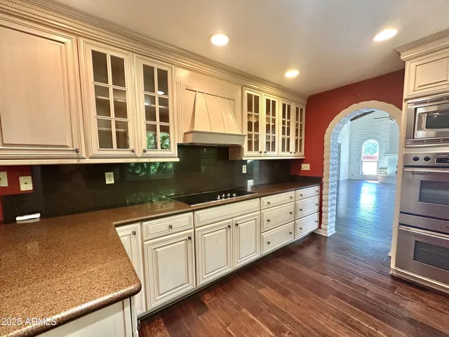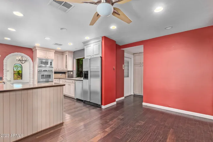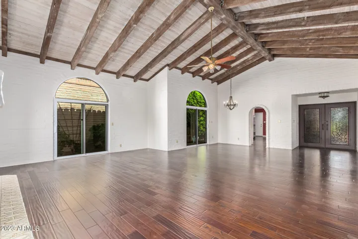 Welcome to the charming, gated community of Villa Valencia! This beautiful single family home features a large stunning courtyard entrance and covered brick walkway to the custom double iron front doors. As you enter the home you’ll feel welcomed by the dramatic architectural details such as a soaring 11′ wood beamed ceiling, exposed slump block walls, wood burning fireplace, rich laminate wood flooring and more! This home has two full bedrooms PLUS an office/den space with closet and sliders to the back patio along with two full bathrooms. Washer & dryer included along with regular landscaping maintenance. This is a very quiet and secure community. Community swimming pool & nice tennis courts across the street. The home sits furthest back from Glendale Ave for ultimate privacy.