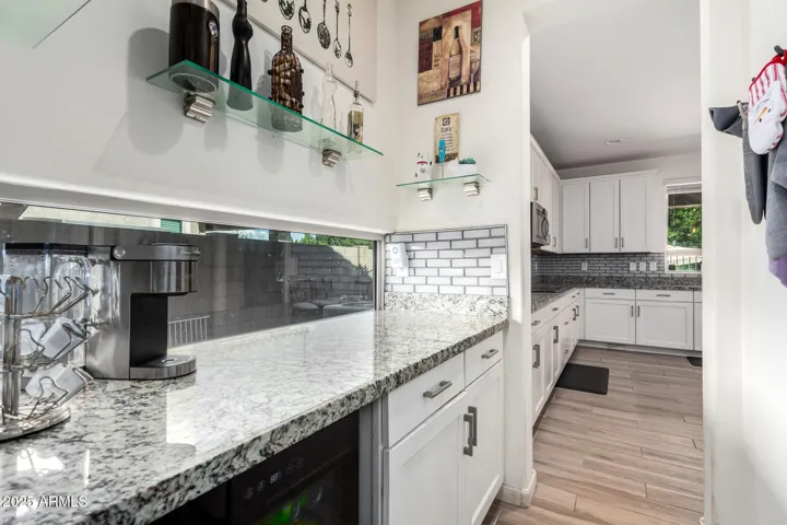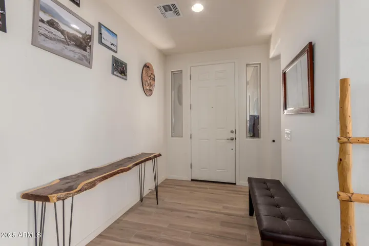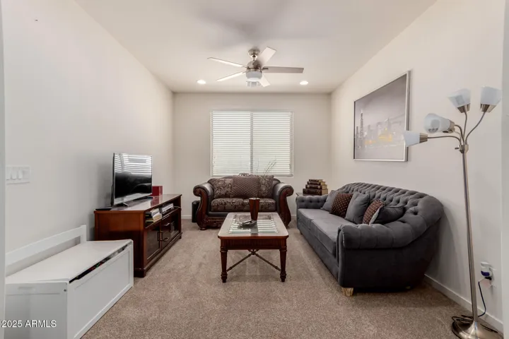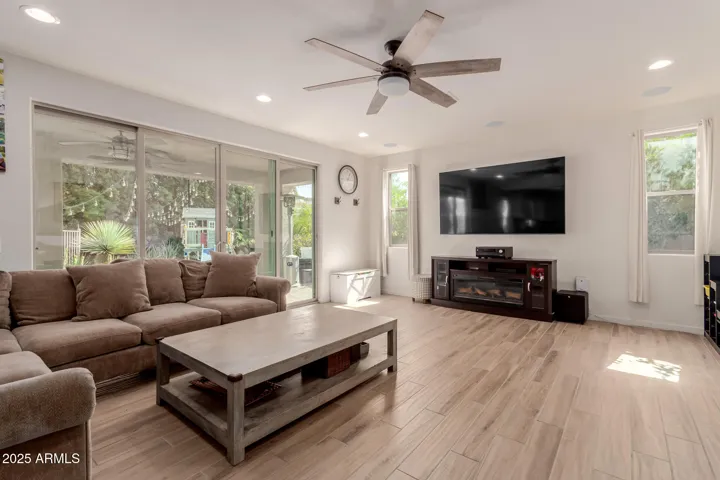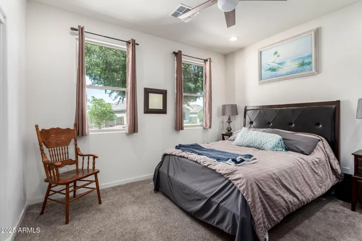 Welcome to upscale living in the gated community of Lehi Crossing! This stunning 5-bedroom, 4-bathroom William Lyon home is situated on an oversized lot that backs up to the canal, offering both space and privacy. The spacious layout features a first-floor bedroom and full bathroom-ideal for guests-as well as a generous laundry room with a sink and cabinet storage, plus expansive dining and living areas. The kitchen is a true showstopper, boasting a large island, granite countertops, stainless steel appliances, a walk-in pantry, and a butler’s pantry. A central vacuum system makes cleaning effortless. Upstairs, the luxurious primary suite includes two walk-in closets, a large soaking tub, dual sinks, and a separate shower. One upstairs bedroom has a private en suite bathroom-perfect for visitors-while the other two bedrooms share a full bathroom with a tub. A versatile loft and workspace sits between the primary suite and the en suite room, ideal for a media space or reading nook. Enjoy built-in surround sound in the main living area, primary bedroom and bathroom, and on the extended outdoor patio. The home also features customizable permanent outdoor lighting for year-round ambiance. Experience the best of Arizona living in your private backyard retreat, complete with a sparkling, gated, lighted pool featuring a travertine deck and a soothing water feature. Savor your morning coffee at the beautiful mosaic concrete table while taking in elevated views of Four Peaks from the raised seating area. The expansive covered patio includes a newly serviced misting system for added comfort. Privacy is ensured by mature ficus trees lining the backyard, and you’ll love the added bonus of fruit-bearing citrus trees. This home has been beautifully upgraded with comfort and entertaining in mind. Don’t miss your chance to see it today!