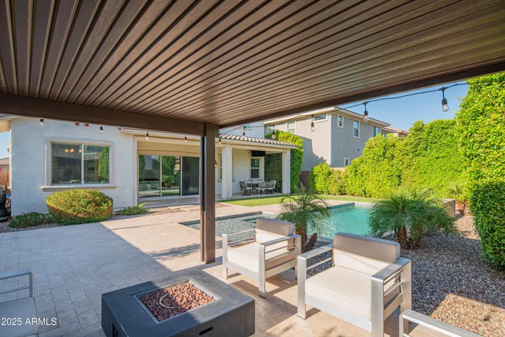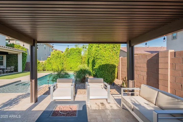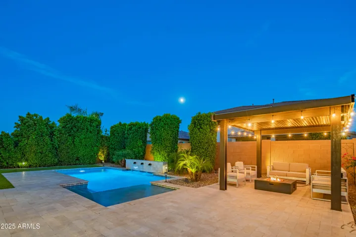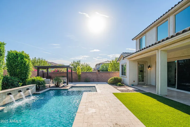 Backyard features a private pool with baja shelf, waterfalls and pebbletec finish. Yard also includes an expanded patio, pergola, travertine pavers, artificial turf and ficus for privacy.