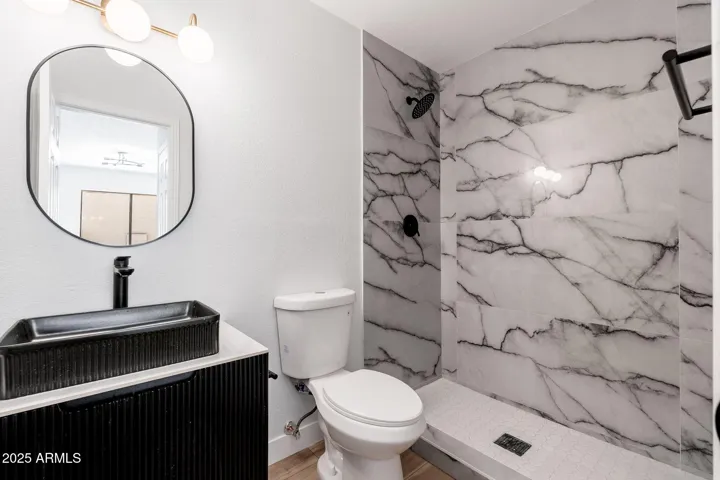 Both bathrooms have been fully upgraded to offer a spa-like experience, complete with high-end shower systems, custom vanities, framed mirrors, and built-in shower niches.