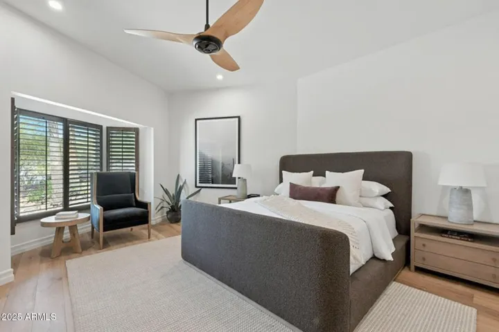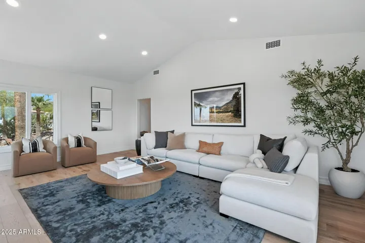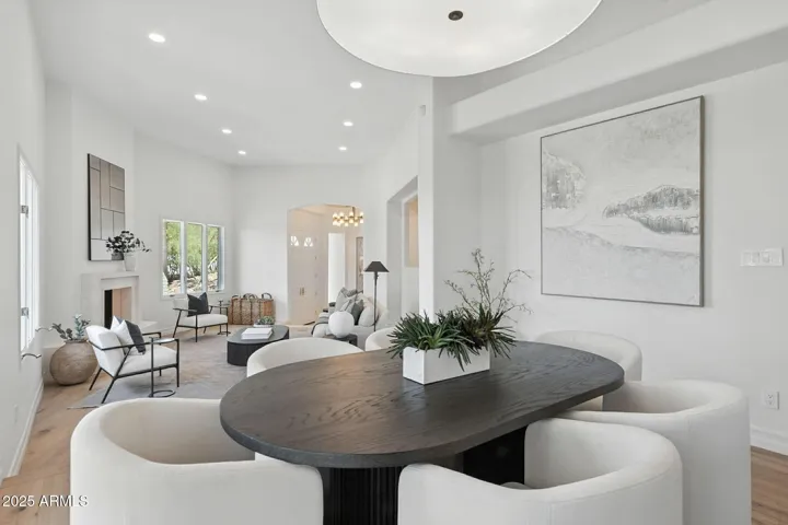 Welcome to this stunning hillside retreat, perfectly situated at the end of a private cul-de-sac with panoramic views from every room. As you approach, you’re greeted by a beautifully manicured front yard designed like a private park, featuring a lush lawn and cozy fire pit surrounded by ample seating an ideal spot to take in breathtaking views of the mountains, city lights, and the 13th hole of the Phoenician Golf Course. Step through the grand double doors into a marble-floored foyer bathed in natural light. This fully renovated home boasts new flooring throughout, fresh paint, upgraded brass hardware, and stylish new lighting fixtures in every room. The spacious living room features a dramatic floor-to-ceiling gas fireplace, creating a warm, welcoming ambiance.