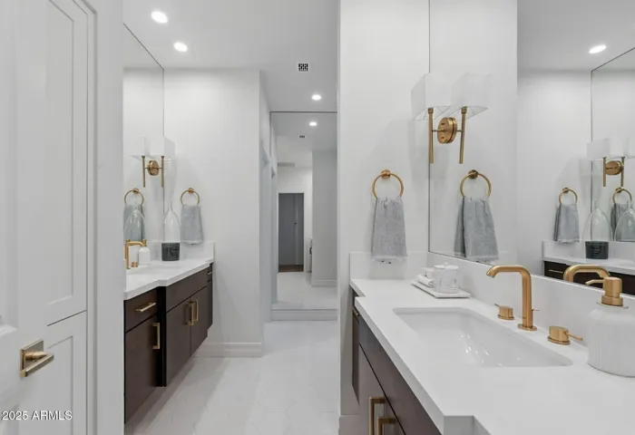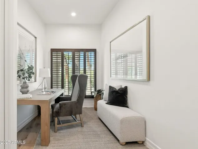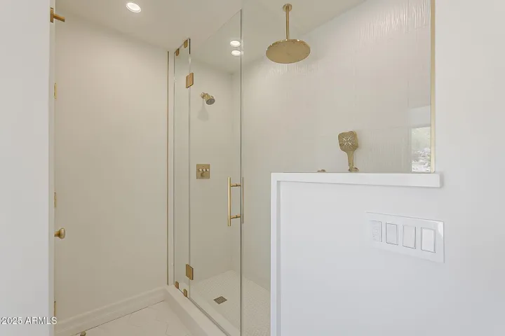 The home includes a versatile exercise room with a convenient half bath, a dedicated office space, and four guest bedrooms, one with an ensuite bathroom. The renovated guest bathroom is spacious and stylish, and an additional half bath adds further convenience.