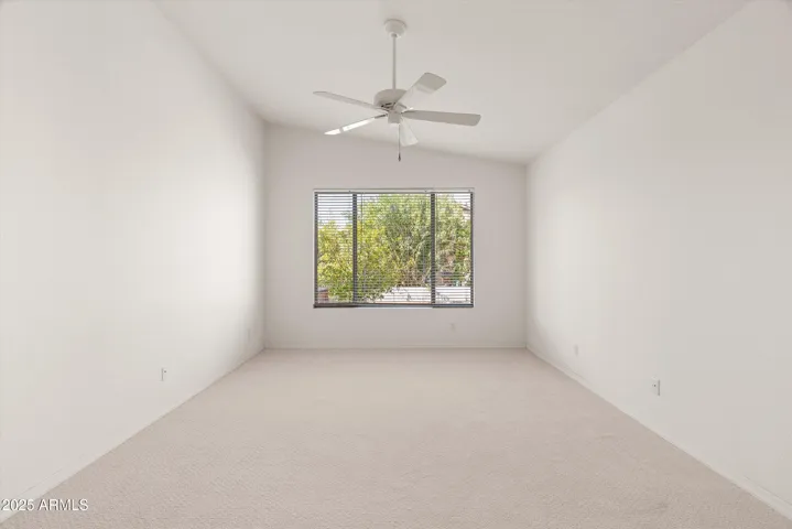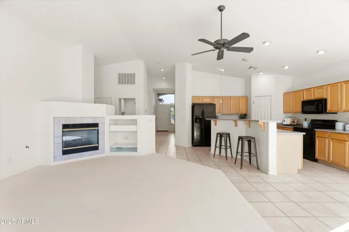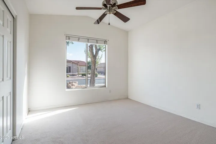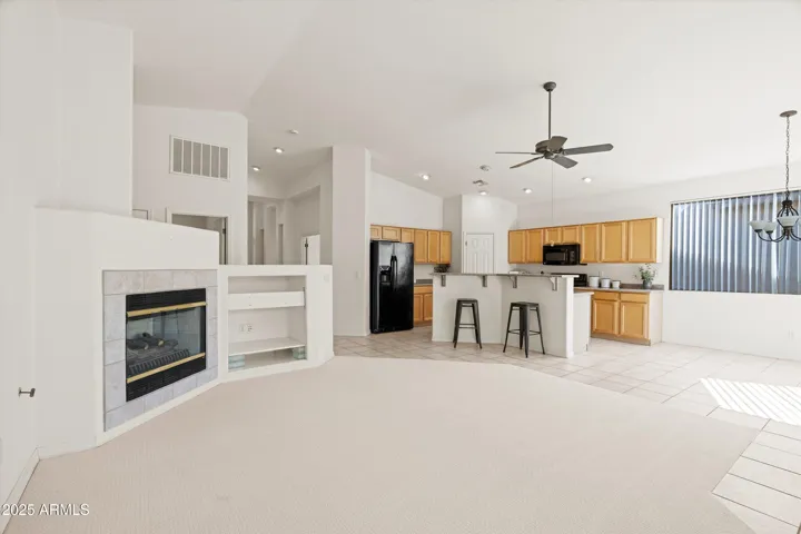 Inside, this single-level home is finished in timeless neutral tones and offers a functional, no-step floor plan perfect for everyday living. Vaulted ceilings and an open-concept design create a light and airy flow from the foyer into the spacious great room, where the chef’s kitchen, dining area, and family room seamlessly come together. The split layout ensures privacy, with the generously sized primary suite located on the east side of the home. The primary bath features new tile flooring, dual vanities, a soaking tub, and a walk-in shower. On the opposite side, you’ll find a comfortable guest bedroom, a full hall bath, and a versatile den that is ideal for a home office, fitness space, or hobby room.
