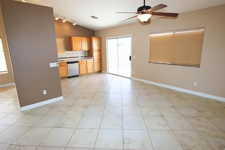 Discover comfort and style in this beautiful 4-bedrooms, 2-baths home perfectly nestled in the sought-after Wildflower Ranch community. Step inside to a spacious, open layout featuring soaring vaulted ceilings, graceful archways, and a warm, inviting atmosphere. Enjoy tile flooring throughout the main living areas, plush carpet in three bedrooms, and rich wood flooring in the primary suite. The generously sized kitchen offers a blend of stainless steel and white appliances, abundant oak cabinetry, and counter space for meal prep. Just off the kitchen, sliding glass doors open to a large private backyard with low-maintenance desert landscaping and a covered patio – perfect for outdoor gatherings and relaxing evenings. The primary bedroom retreat boasts a double-sink vanity, walk-in shower, and luxurious jacuzzi tub for the ultimate in relaxation. A convenient laundry room with washer/dryer hookups, a 2-car garage, and beautiful curb appeal complete the package.