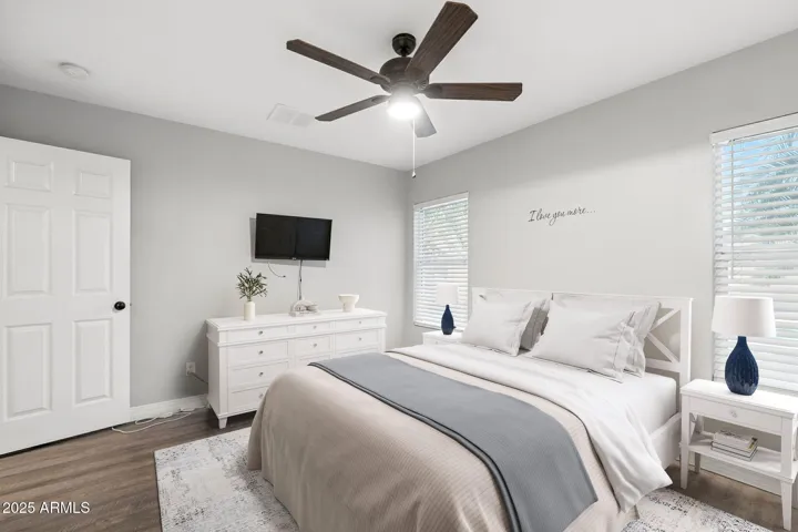 Don’t miss this charming 2 bed, 2 bath single-level gem in peaceful Sundance! Featuring a private sparkling pool with a water feature, this home offers incredible value. Inside, enjoy bright open spaces with plantation shutters, modern LVP flooring throughout- no carpet! A sunlit eat-in kitchen with stainless steel appliances, white shaker cabinets, and pantry. The spacious primary suite boasts a full bath en-suite. Step outside to your backyard oasis—palm trees, a large extended patio, and room to relax or entertain. All just a mile from shopping and dining. This is the one you’ve been waiting for!