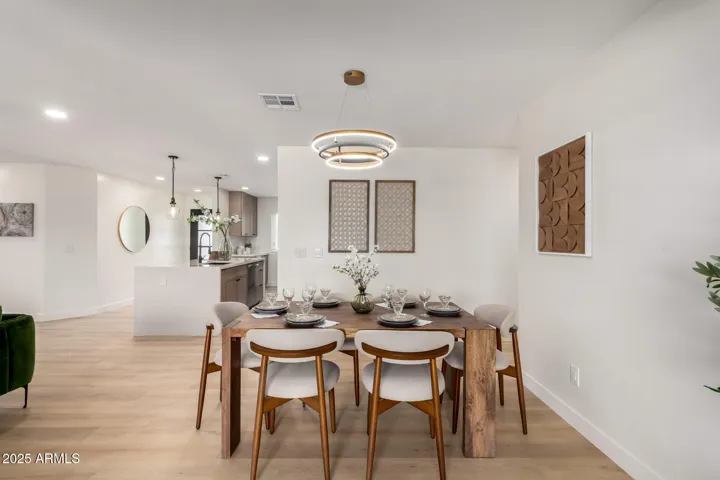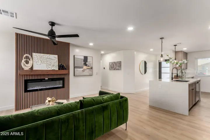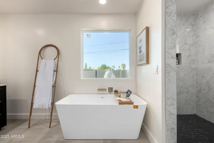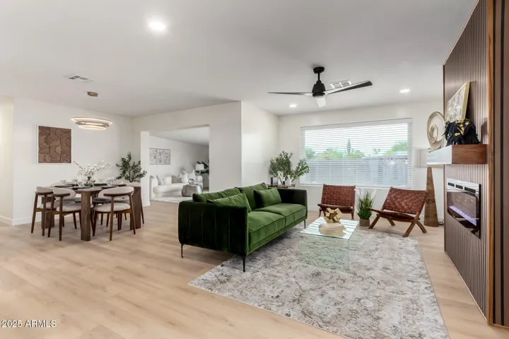 BRAND-NEW LUXURY MASTER BATHROOM – Fully remodeled 3-bedroom, 2-bathroom home with added square footage in prime North Phoenix location! The new master bathroom addition features a spacious bathroom with a freestanding tub, walk-in shower, and double vanity sink with modern finishes. The open floor plan includes a fully remodeled kitchen with new cabinets, quartz countertops, and stainless steel appliances. There’s brand new flooring, doors, and windows throughout the home. The living room features an electric fireplace and flows into the dining area, kitchen, and a separate family room for extra space.