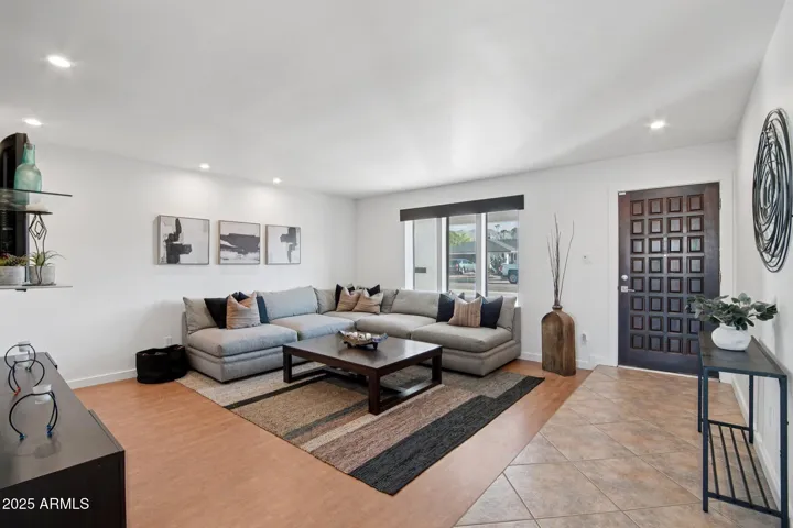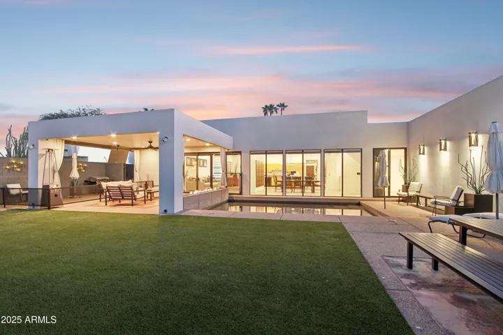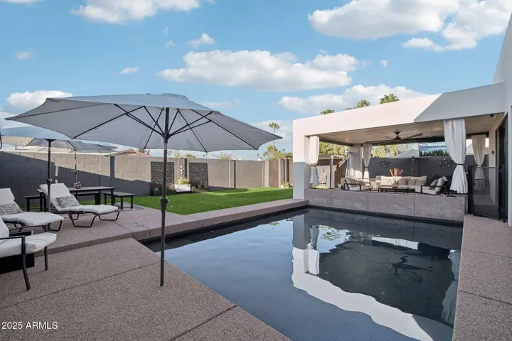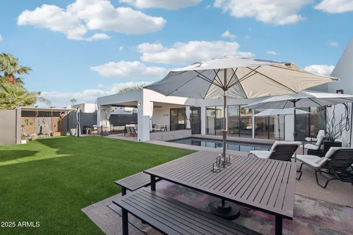Welcome home to this beautifully updated single-level sanctuary tucked in the coveted Paradise Valley Foothills corridor. Sitting on a 10,151 sq ft lot, this 2,856 sq ft home blends sophisticated design, thoughtful upgrades, & seamless indoor-outdoor living—perfect for today’s Arizona lifestyle. A custom iron sliding barn door welcomes you into the main living space, setting the tone for the home’s modern aesthetic and airy flow. Step inside to soaring ceilings, clerestory windows & a wall of glass windows that flood the kitchen, dining & family room with natural light & frame serene backyard views. The kitchen shines with an expansive kitchen island that seats 8, gas-cooktop, convection double ovens, filtered water & sleek cabinetry—ideal for entertaining or easy everyday living. Just off the family room, a versatile den with a half bath & a flexible bonus room provide space to work, play, and/or easily convert the bonus room into a fourth bedroom. Retreat to the luxurious primary suite, featuring a fully renovated spa-inspired bath with floating dual vanities, a custom walk-in tiled shower, and a skylight that opens for a fresh-air escape. Outside, your private backyard oasis delivers the ultimate Arizona vibecomplete with a sparkling pool, lined with a built-in gas firepit that adjoins the pool & covered patio complete with recessed lighting, synthetic turf, pergola & direct access to the side gate with access to the third-car garage or workshop.
