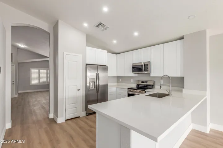 This beautifully renovated 4-bedroom, 2-bath home is located in a quiet neighborhood. No HOA, OWNED solar – what more could you ask for?! Inside, you’ll find a stunning kitchen with white shaker cabinets, quartz countertops, stainless steel appliances, and generous counter space, ideal for entertaining. Vaulted ceilings and recessed lighting. The home also features fresh paint, brand-new luxury vinyl flooring, plush carpet, and modern fixtures throughout. Outside, enjoy a low-maintenance backyard with a covered patio and a detached storage shed for extra space. Conveniently close to shopping, dining, & major freeways.