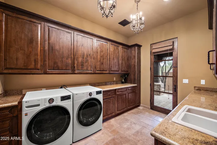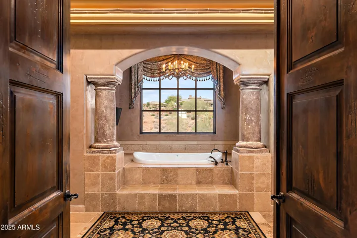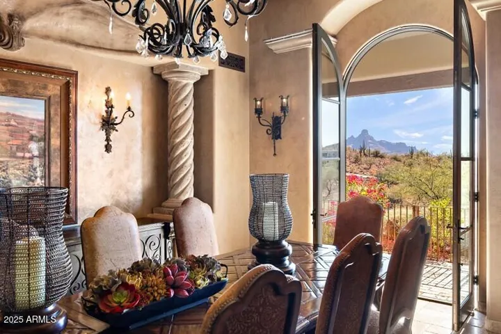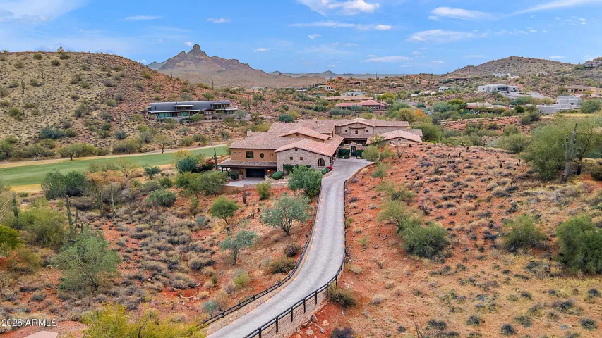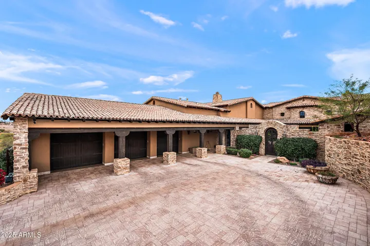Embrace la dolce vita in this magnificent Tuscan estate, brimming with timeless Old World charm. Situated on a 1.79 ac lot the home is designed to capture views of Four Peaks, Red Mountain, and the Firerock Country Club golf course. A stretched paver driveway over a private bridge with whitewashed stone walls leads to a gated courtyard with bubbling fountains, fruit trees, and vibrant planters. Multiple sets of arched doors seamlessly connect the courtyard and terraces to the heart of the home, creating an effortless indoor/outdoor lifestyle. Inside bespoke architectural details include 18-20′ dramatic dome and wood-beam ceilings, imported stone, hand-carved woods, 10′ Cantera fireplace, and Venetian plaster walls. The home is one level with spacious 5 bedrooms/ensuites + seperate guest casita. Outdoor living is the showpiece with expansive terraces and a tiered pool featuring a two-story waterfall, stone slide, and plunge and play pool. Turnkey elegance awaits as furnishings are included. This extraordinary estate is one to be experienced in person to fully appreciate its artistry, scale, and one-of-a-kind details.