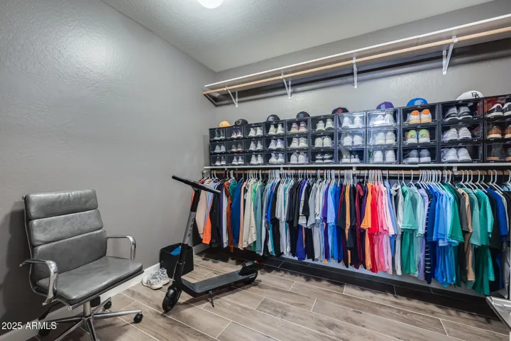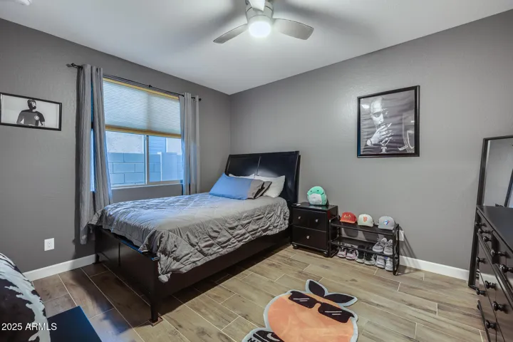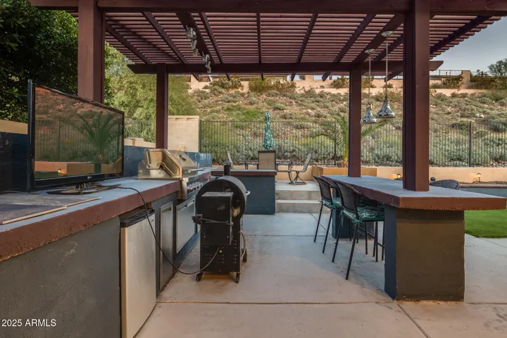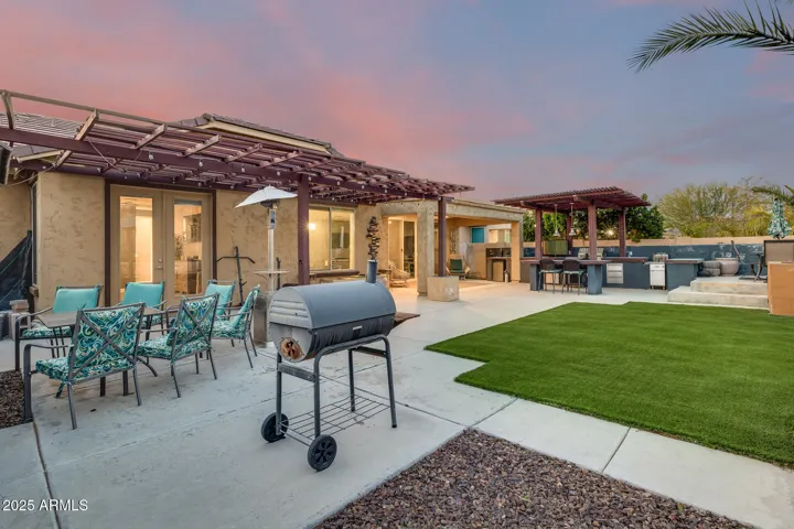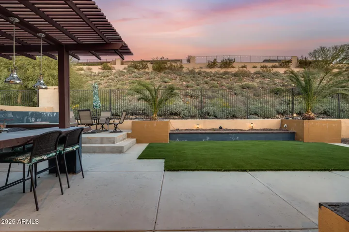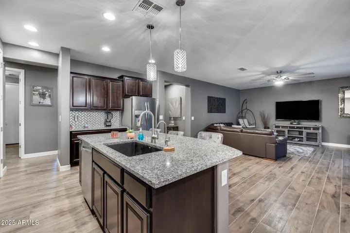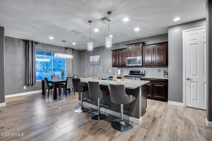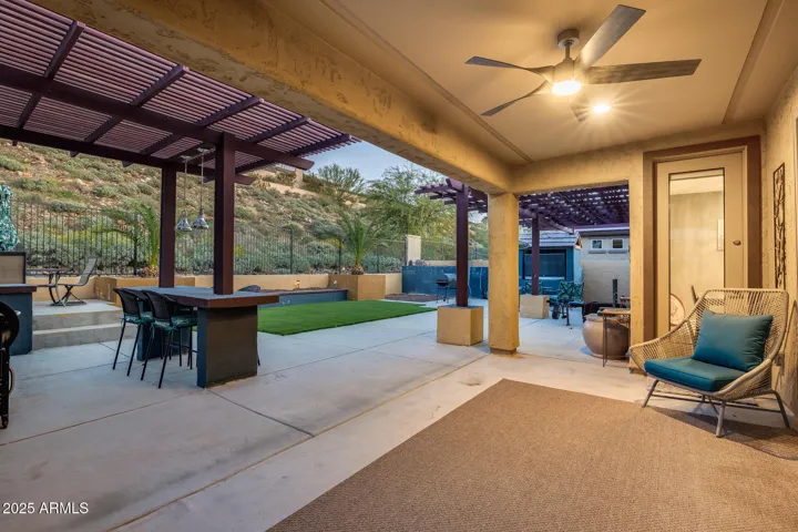 A Contemporary Arizona Gem being offered FULLY FURNISHED! Nestled on a slight hillside location with mountain views. This home boasts a large front courtyard area, plank flooring throughout, with a spacious great room with sliding doors leading to covered patio, outdoor kitchen, and pergola seating area. The chef’s kitchen features a gas stove, granite countertops, stainless & black appliances, large island with breakfast bar, pantry, and ample cabinetry. The oversized primary suite offers a cool gray palette, electronic shades, and French door patio access. En suite includes double vanity, large walk-in shower, linen closet, separate water closet, and expansive walk-in closet. Split floorplan has two large additional bedrooms plus a flexible front room (office or formal living/dining). Laundry room has added cabinetry & space for an extra fridge. Low-maintenance yard with synthetic grass & custom lighting. Prime location near schools, shopping, dining, freeways, Paloma Community Park & Lake Pleasant. Move-in readyjust bring yourself!