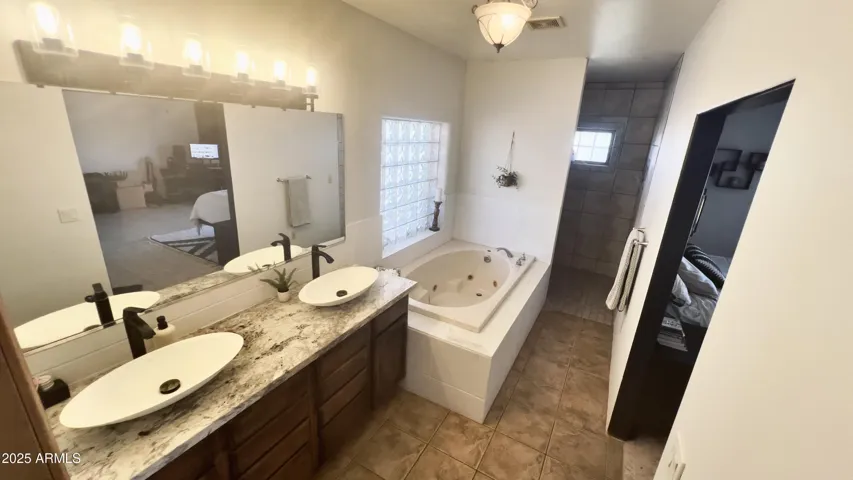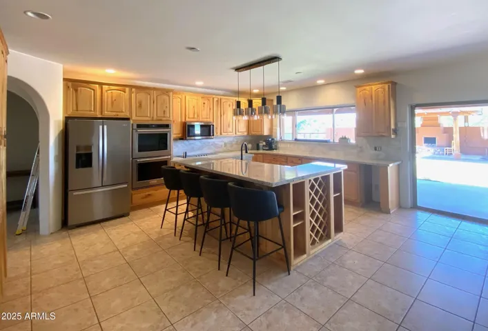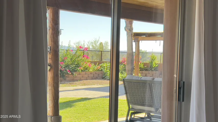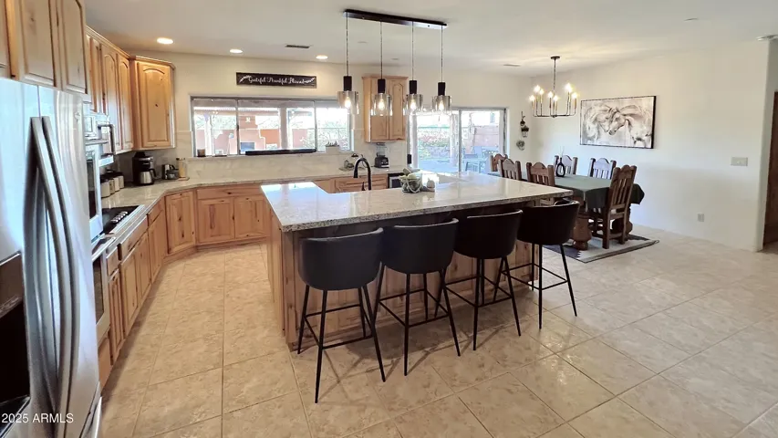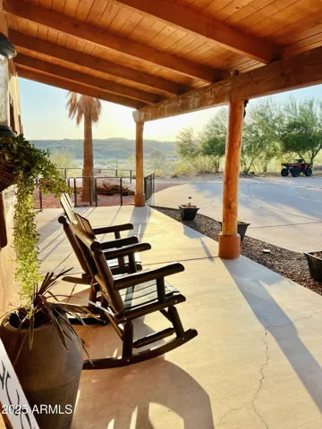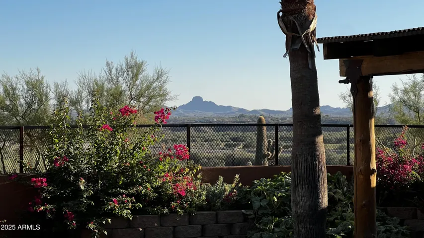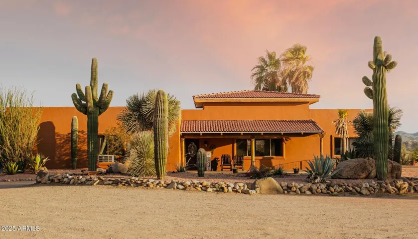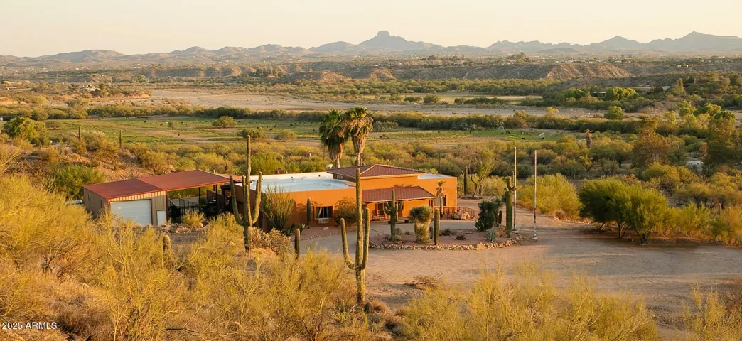 Warmth & Personality greet you at the front door & welcome you into the Grand Living Room w/ Soaring Ceilings adorned w/ massive Round Timber Beams. Expansive arched entry leads into the Heart of the Home. This expansive kitchen space is where you will enjoy everything from your first cup of coffee at dawn to family dinners. GRANITE counters. Marble backsplash. Dual ovens, Kitchen Island w/ Wine Rack. Sliding Glass Patio Doors invite you into a covered, Outdoor Living Space, enclosed w/ tall courtyard walls for comfort & safety for you & your furry family. Impressive views of Vulture Peak. Property offers your guests 2 FULL HOOKUPS for RV’s, a 30 & 50 AMP/ another 30AMP-125V at Carport/ & a 50AMP-250V in the 20×42 Shop/RV Garage!