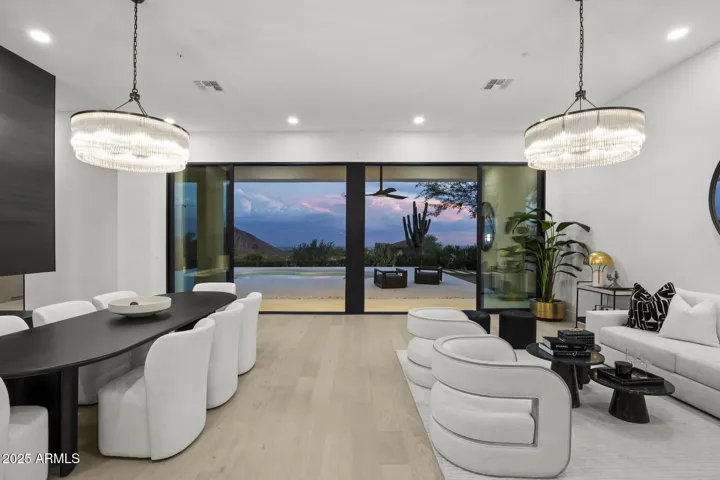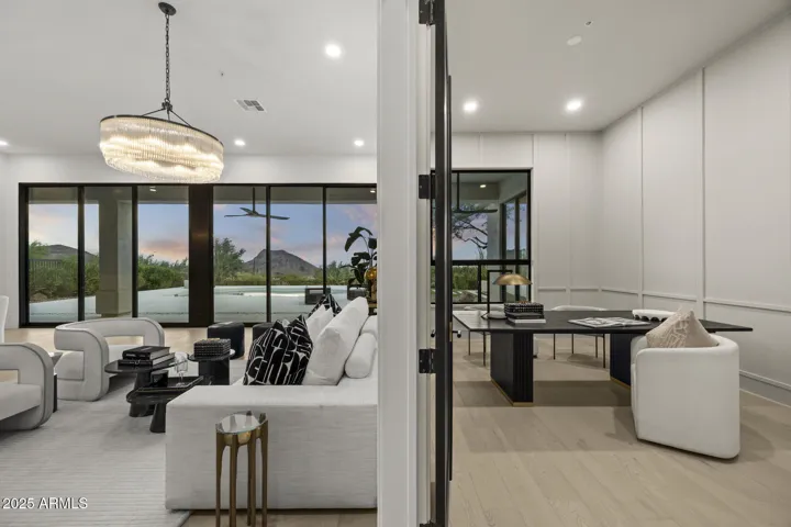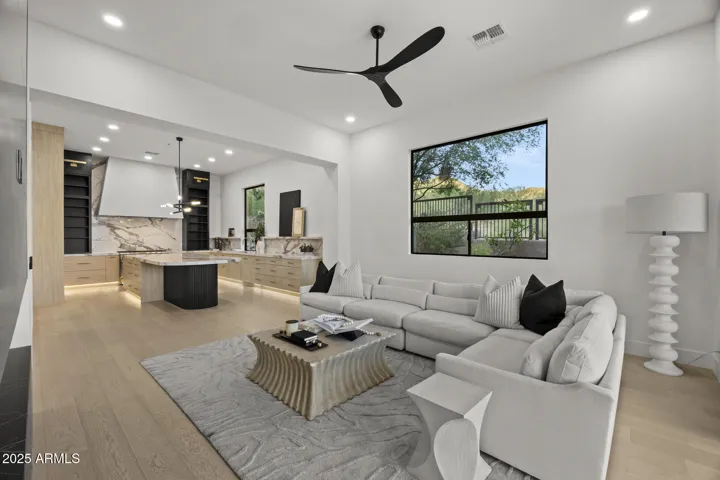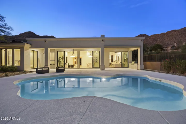 Fully remodeled luxury with city lights and mountain views. Designed by award winning Candice Quinn of London Pierce Design, this reimagined, 4,458 sq.ft. 1-story residence blends modern luxury with timeless craftsmanship. Anchored with new wide-plank white oak hardwood flooring and framed by custom millwork, your eyes will be immediately drawn to the state-of-the art floating fireplace by EcoSmart. You won’t linger for long as the home opens with two (2) 12-foot multi-slide glass doors in the living room, dissolving the boundaries between indoors and outdoors, while showcasing dramatic mountain views and city lights below. A resort-style backyard awaits with new Pebble Tec finish, freshly painted cool deck, a second EcoSmart outdoor fireplace, built-in BBQ turf-lined entertaining spaces. The chef’s kitchen features custom natural wood and black SOLLiD cabinetry, Calacatta Carmen quartz counters, Wolf 8-burner range with plaster hood, Sub-Zero refrigeration, Cove dishwasher, and a hidden scullery with Wolf and Monogram appliances for daily use and perfect for entertaining guests.