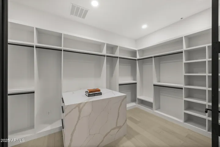 The primary suite offers a spa-inspired bath with curb-less shower, stand-alone tub, designer lighting, and a custom walk-in closet.