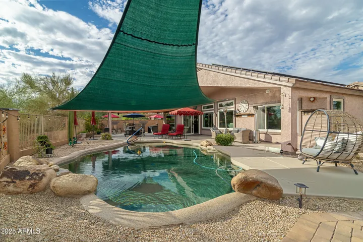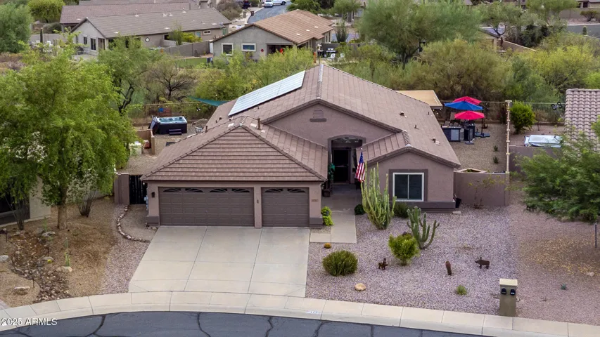 WOW This stunning 3 bedroom 2 bath plus den house in Superstition Foothills has it all. The resort-style backyard is perfect for year-round entertaining, featuring a large PebbleTec pool, a brand-new hot tub, and an expansive covered patio with an island kitchen BBQ. This turnkey residence boasts numerous recent updates, including new Anderson windows and slider (2024), a new roof (2025), updated insulation for enhanced energy efficiency, a new walk-in shower in the primary bathroom (2024), fresh interior and exterior paint (2024), a new irrigation system (2024), and new water heater and new pool pump/filter. With all this you get OWNED and paid for solar and most of the outdoor furniture stays with the home. Don’t miss this house, it shows as good as it looks in the photos
