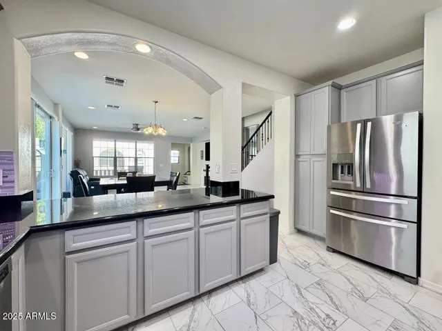 Beautifully maintained 3 bed, 2.5 bath home in sought-after Dobbins Place! Pride of ownership shines throughout this upgraded two-story Craftsman home with front porch area. The home features 12×24 tile flooring downstairs, upgraded stair railing, and plush carpeting upstairs. The kitchen boasts gray cabinets, stainless steel appliances, granite countertops, and recessed lighting with Google Smart bulbs. Spacious primary suite offers mountain views, a walk-in closet, barn door to the en-suite bath, dual sinks, private toilet room. Upstairs laundry for added convenience. 2” wood blinds and ceiling fans found throughout the home. Enjoy the low-maintenance backyard with artificial turf and 2-car garage. Short walk to the community pool and play area!