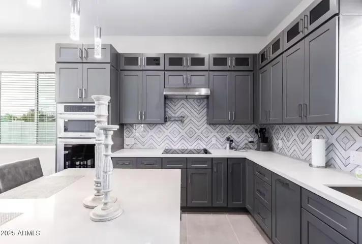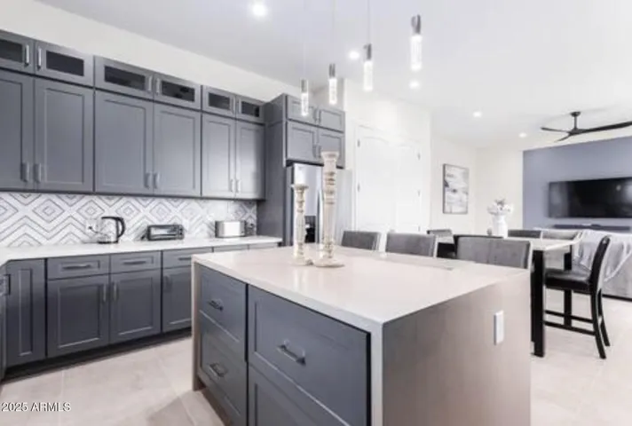 Chef’s Kitchen: High-end cabinetry, striking backsplash, pendant lights over a waterfall island, and abundant can lighting.