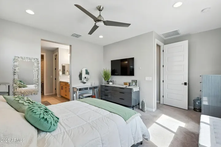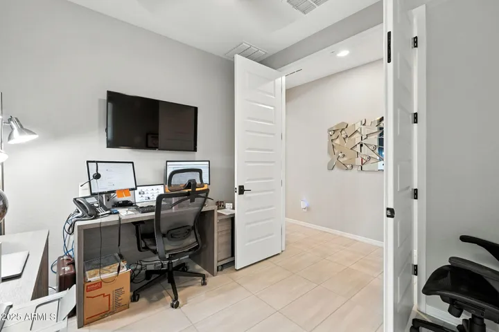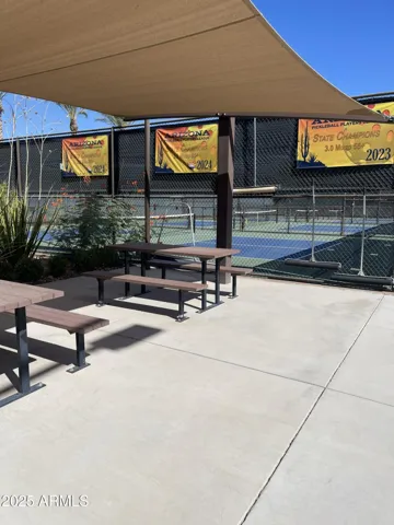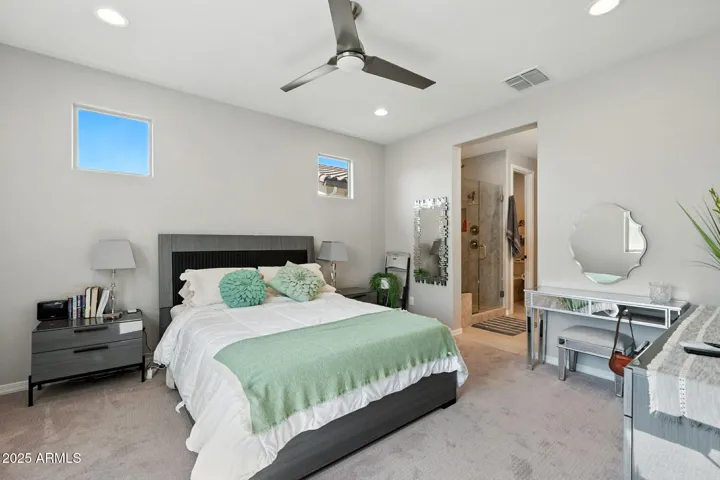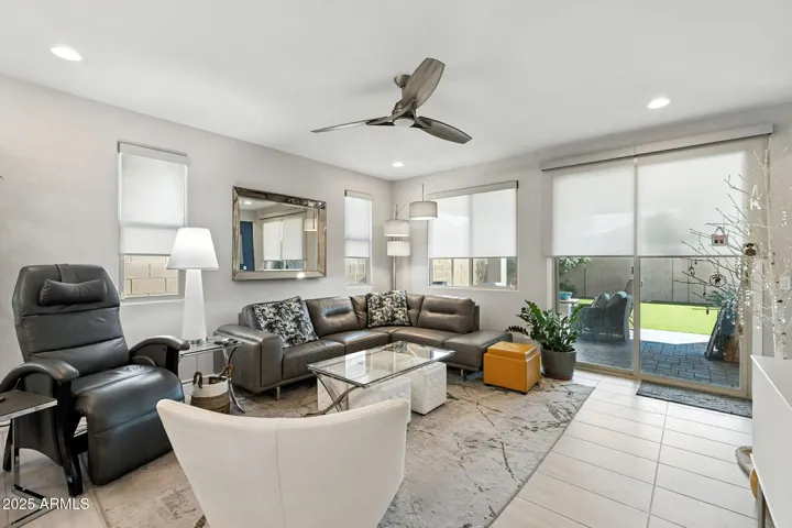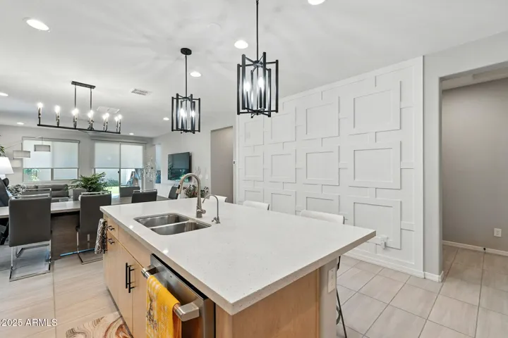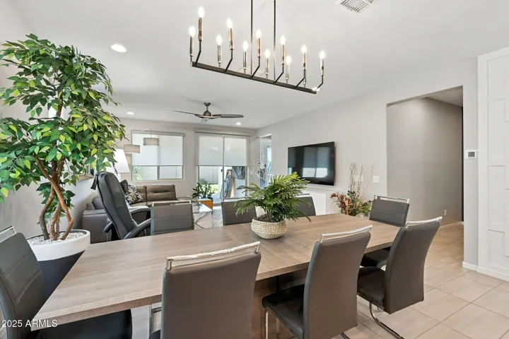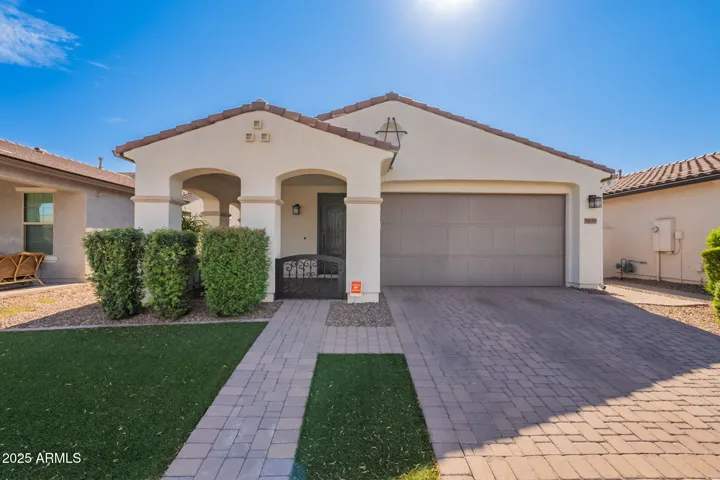Stunning 2 bedroom, 2 bath home with a den in the 55+ community of Encore at Eastmark. Home is highly upgraded! Enter the home through the large iron door and front patio w/ iron gates.Home features great room concept with eat in kitchen. Kitchen has upgraded cabinets that roll out, panty, large island with R/O, stainless appliances including refrigerator, gas range/oven, granite counters and tiled backsplash. Primary bedroom has a spacious shower, dual sinks, granite counters, large walk in closet with access to the laundry room ( washer and dryer are 2 months old and covey). Home has upgraded fans and light fixtures, automatic blinds and decorative walls. Backyard is easy to maintain with covered patio, tv, and upgraded turf. Garage has epoxy floors, refrigerator & additional storage.