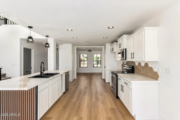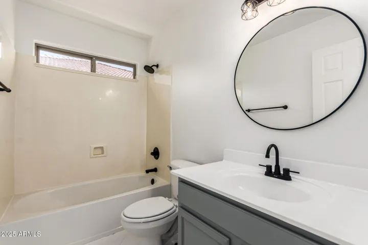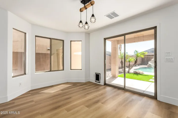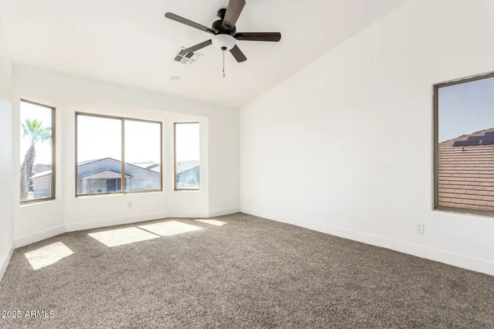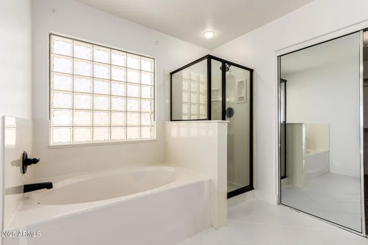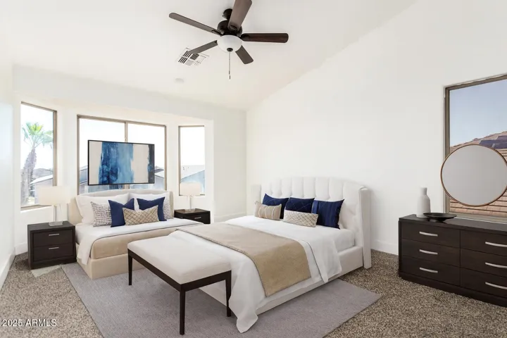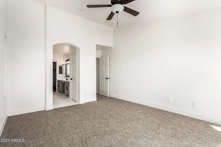 Retreat to the luxurious primary suite with bay windows, vaulted ceilings, and a graceful archway leading to the private spa-like bathroomcomplete with dual vanities, soaking tub, and walk-in shower.