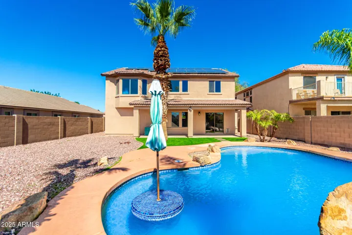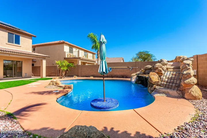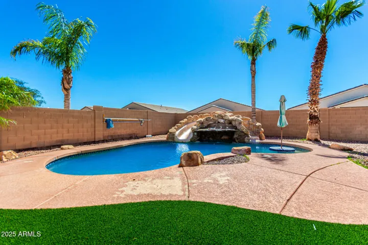 The true showstopper is the resort-style backyard. Designed for both relaxation and fun, it features a sparkling pool with waterfall and built-in slide, surrounded by lush tropical/desert landscaping and expansive views. The RV gate and parking add convenience and functionality for all your toys and hobbies.
