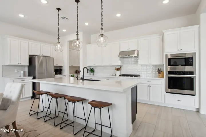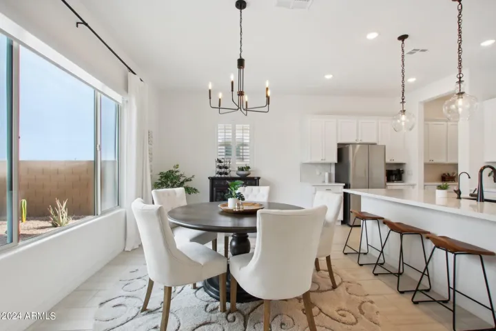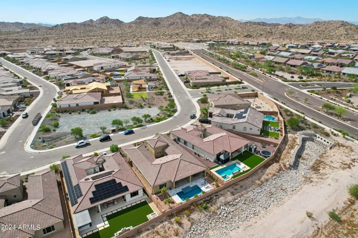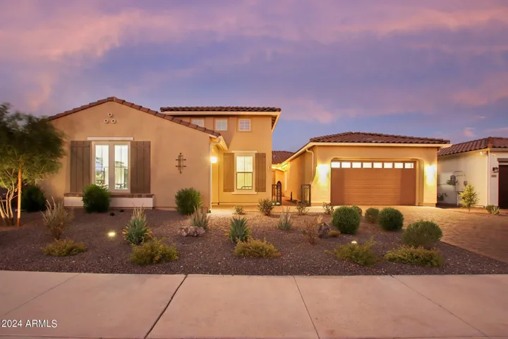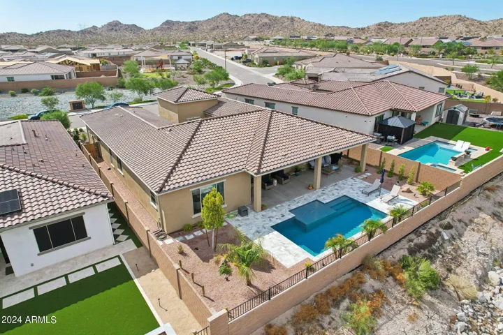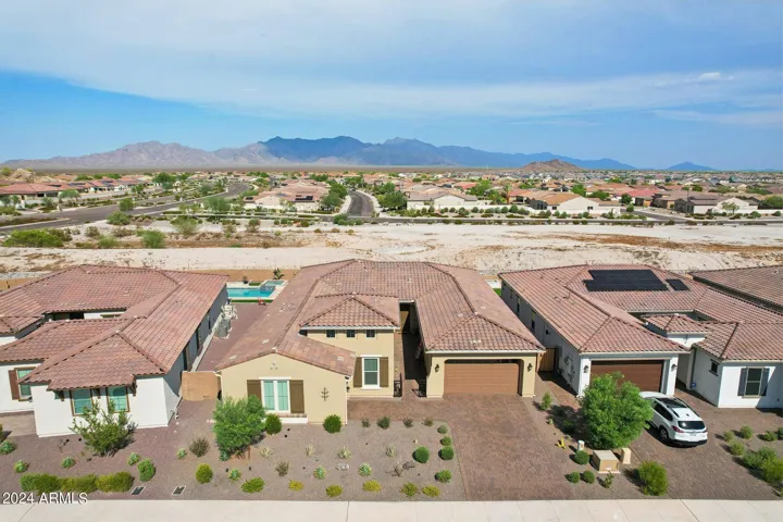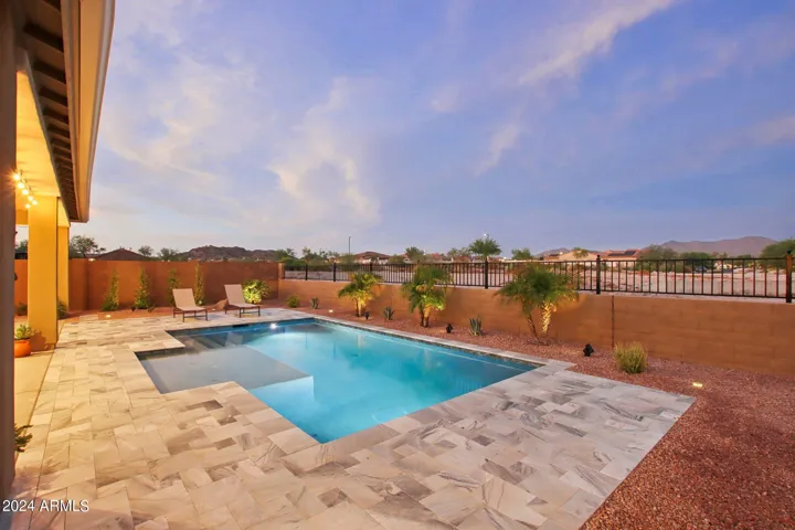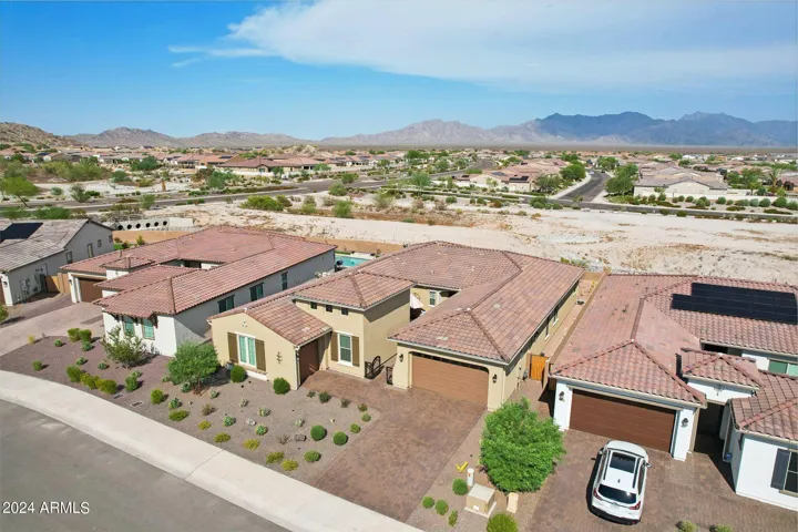 Just Reduced $20K! Newer 2023 William Ryan Lyra model with $315K in upgrades is gorgeous & ready now! 3216 SF single level, premium view lot, 3 car garage & new pool w/professional landscaping. Gated courtyard. 4 BR, 3.5 baths plus enclosed den/office. Spacious & private guest suite offers a 2nd master. 10′ ceilings, 8′ doors, Upgraded 12 X 24” tile flooring everywhere except bedrooms. Quartz counters T/O kitchen and baths. Gourmet kitchen boasts a huge island, gas cooktop, stainless steel appliances and butler & large walk in pantry. 16′ multi slider in great room opens to extended covered patio. Short walking distance to Presidio Resident’s Club w/heated pool, fitness center & restaurant. Enjoy all the amenities including golf that Estrella has to offer. Gorgeous home & yard w/Mtn view