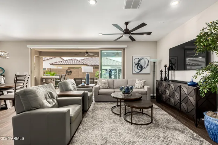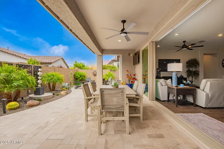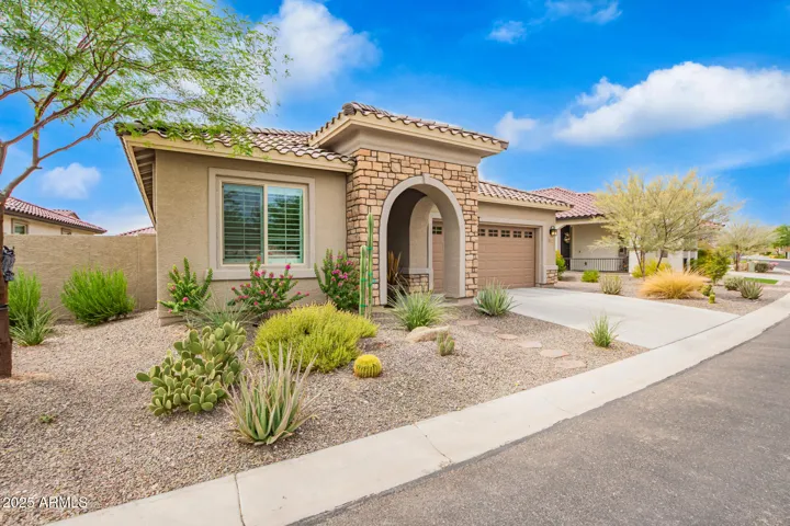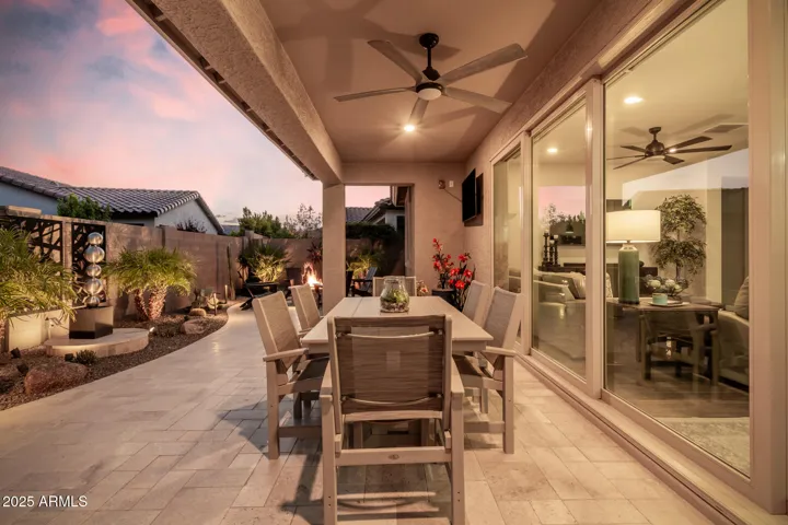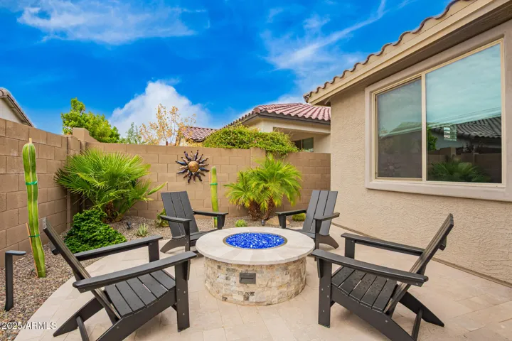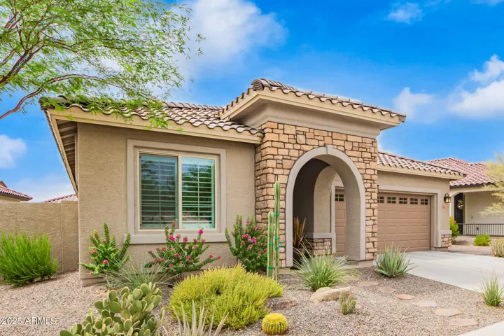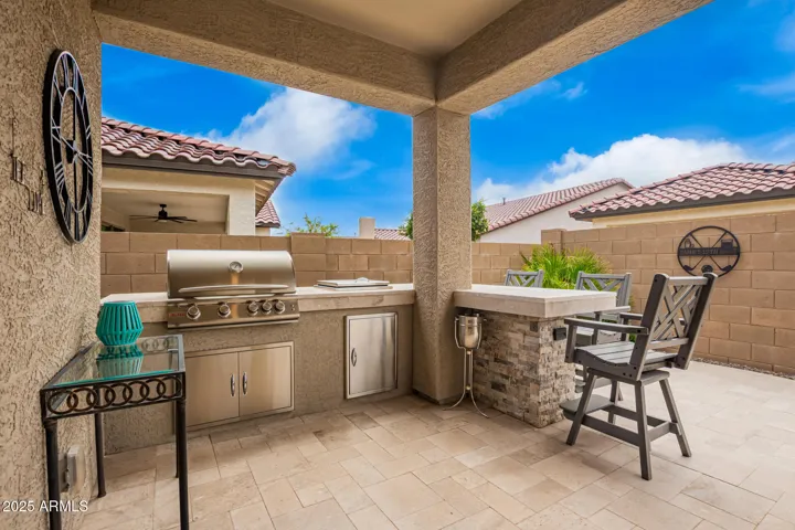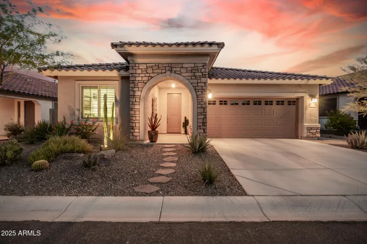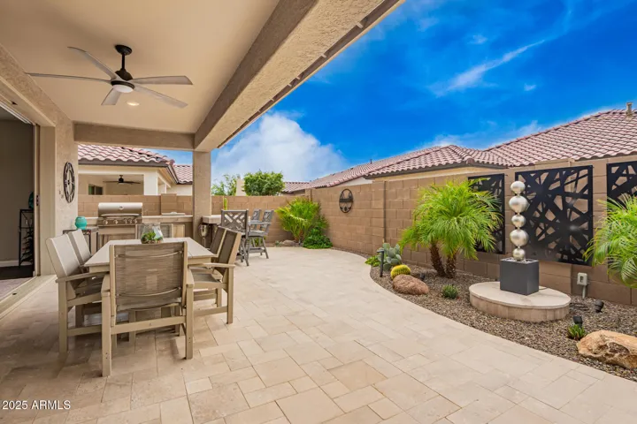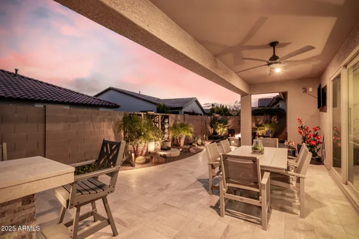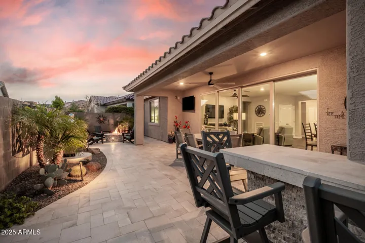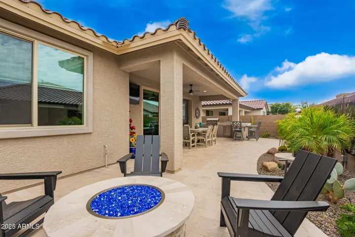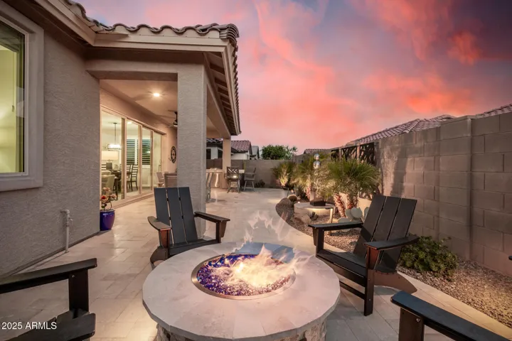 Open floor plan, single-story home with custom finishes inside. Home has a split floor plan with master bedroom in the back overlooking the travertine patio with built-in fire pit, BBQ, bar top with seating & a water fountain. The home features wood plank tile flooring throughout, kitchen with stone counters, large island, stainless steel appliances, storage & plenty of space to entertain. Large multi-panel sliding glass door in living room & kitchen opens to professional finished backyard with privacy. Master bath has dual vanity sink, walk-in tile shower master closet with storage that opens to a spacious laundry with storage. Home also offers a den with custom-made barndoors. Spacious garage with epoxy flooring, built-in cabinet sink basin, water softener& tankless water heater. The active adult community of Victory in Verrado offers endless amenities: pickleball courts, gym, pools, spa, dining & endless views of the valley & WhiteTank Mountains. Victory also has access to all the amenities of Verrado as well: golf, fitness center, pools, parks, pickleball courts & more.