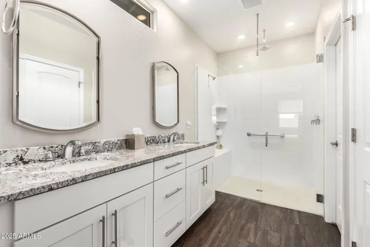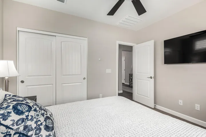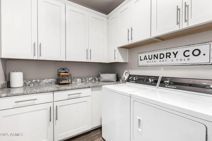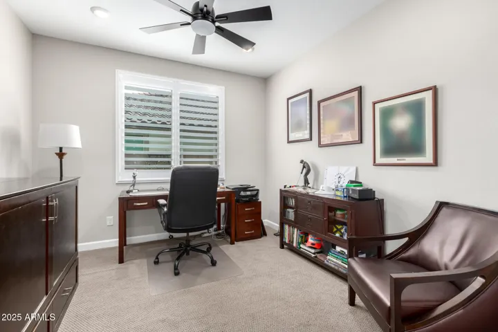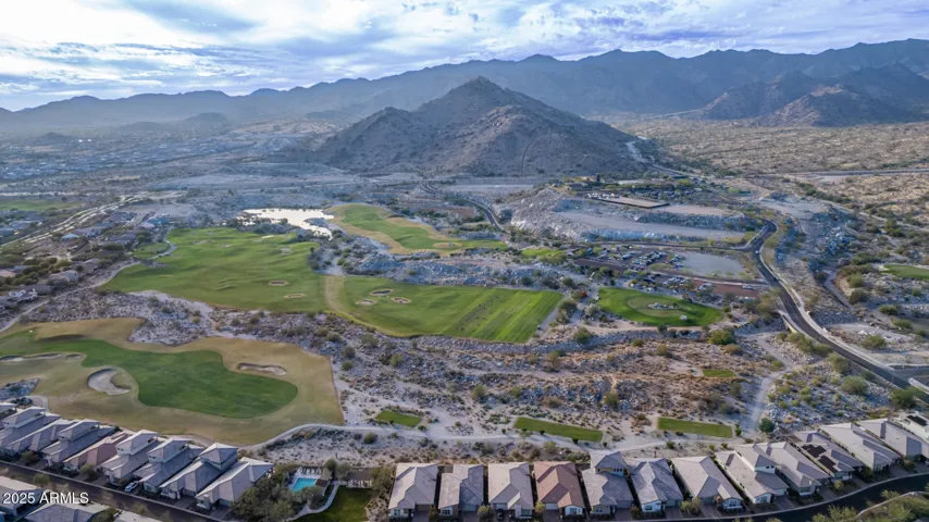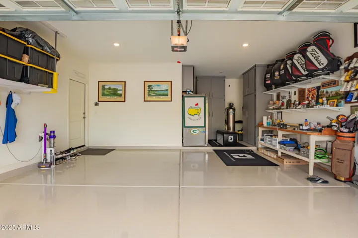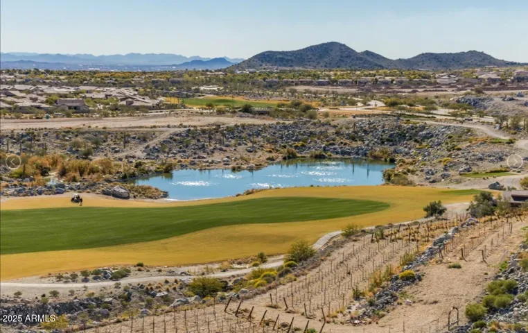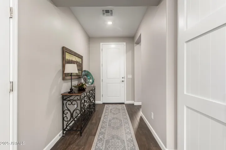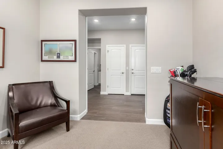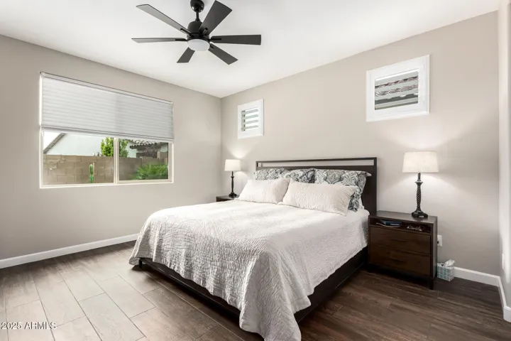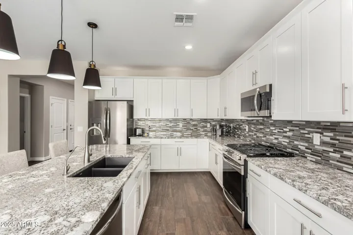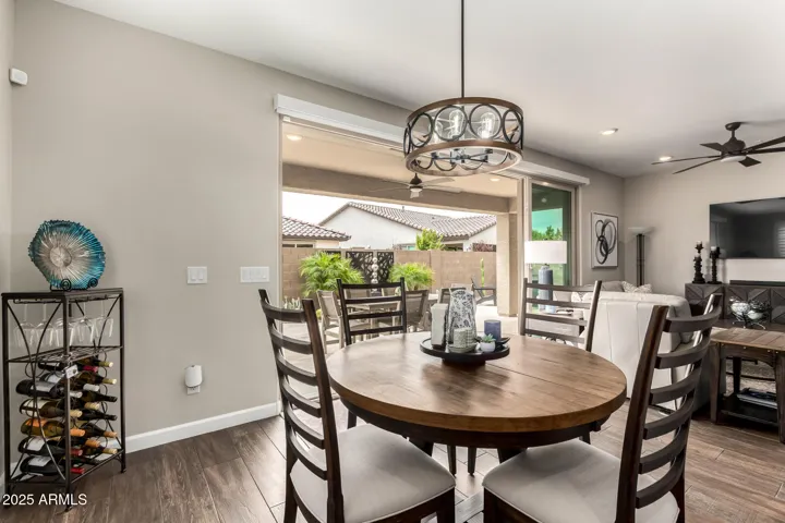 Open floor plan, single-story home with custom finishes inside. Home has a split floor plan with master bedroom in the back overlooking the travertine patio with built-in fire pit, BBQ, bar top with seating & a water fountain. The home features wood plank tile flooring throughout, kitchen with stone counters, large island, stainless steel appliances, storage & plenty of space to entertain. Large multi-panel sliding glass door in living room & kitchen opens to professional finished backyard with privacy. Master bath has dual vanity sink, walk-in tile shower master closet with storage that opens to a spacious laundry with storage. Home also offers a den with custom-made barndoors. Spacious garage with epoxy flooring, built-in cabinet sink basin, water softener& tankless water heater. The active adult community of Victory in Verrado offers endless amenities: pickleball courts, gym, pools, spa, dining & endless views of the valley & WhiteTank Mountains. Victory also has access to all the amenities of Verrado as well: golf, fitness center, pools, parks, pickleball courts & more.