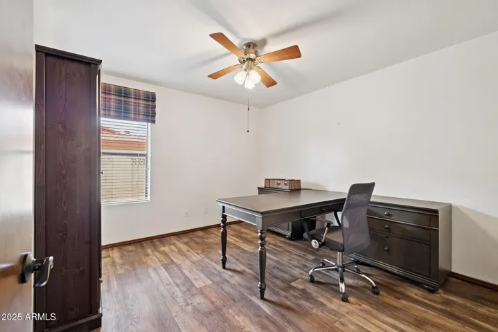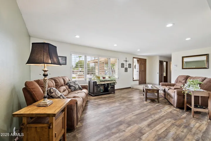 Beautifully updated single-level home offering 4 bedrooms and 2 bathrooms with timeless upgrades throughout. Newer vinyl plank and tile flooring flow seamlessly, creating a warm and inviting feel. The kitchen features granite countertops, upgraded cabinetry, stainless appliances, and a beverage station with bar fridge—perfect for entertaining. Stay comfortable year-round with two newer AC units (2020 & 2022), plantation shutters, tiled showers, and a cozy fireplace. Functional highlights include a spacious laundry room with storage, two water heaters, garage cabinets with pull-down attic access, and a separate workshop. Outdoor living shines with a huge covered patio, RV gate, and no HOA. Prime location close to shopping, dining, and everyday conveniences.